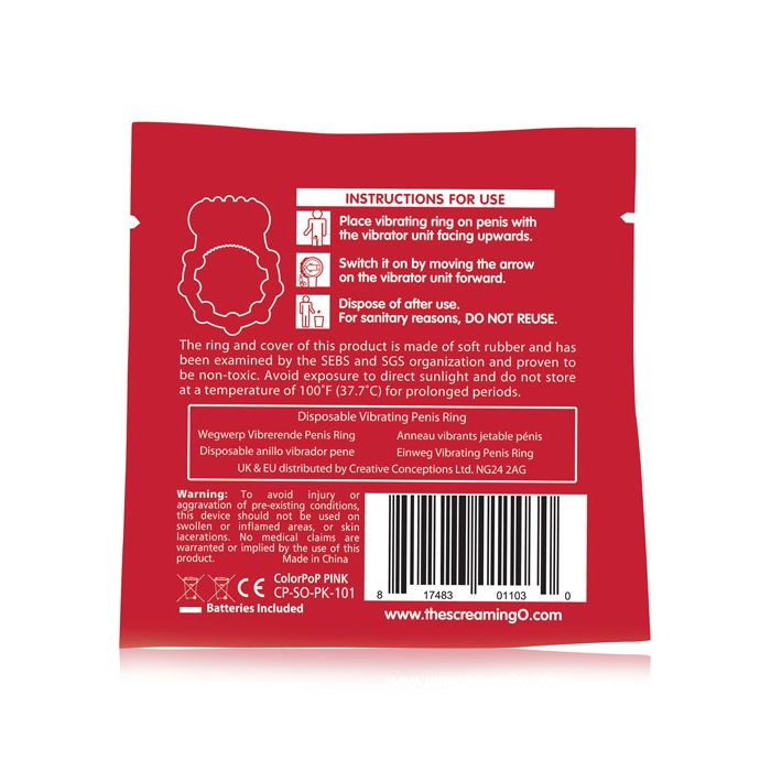 The Screaming O Vibrating Ring is the award-winning sex secret that helps couples have better, more satisfying sex! With pleasure knobs for him and ticklers for her, couples enjoy mutual stimulation with vibration that buzzes throughout the entire ring. Now available as a convenient ColorPoP Quickie, couples can enjoy vibrant vibration at home or on the go with a disposable design they can take anywhere!