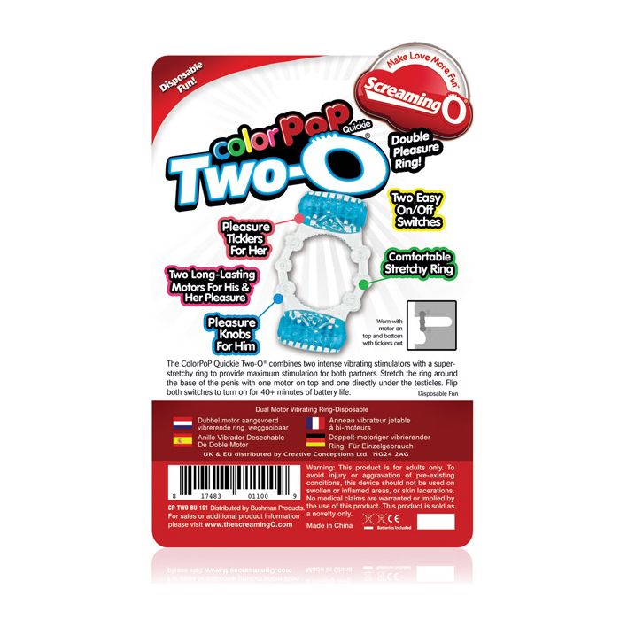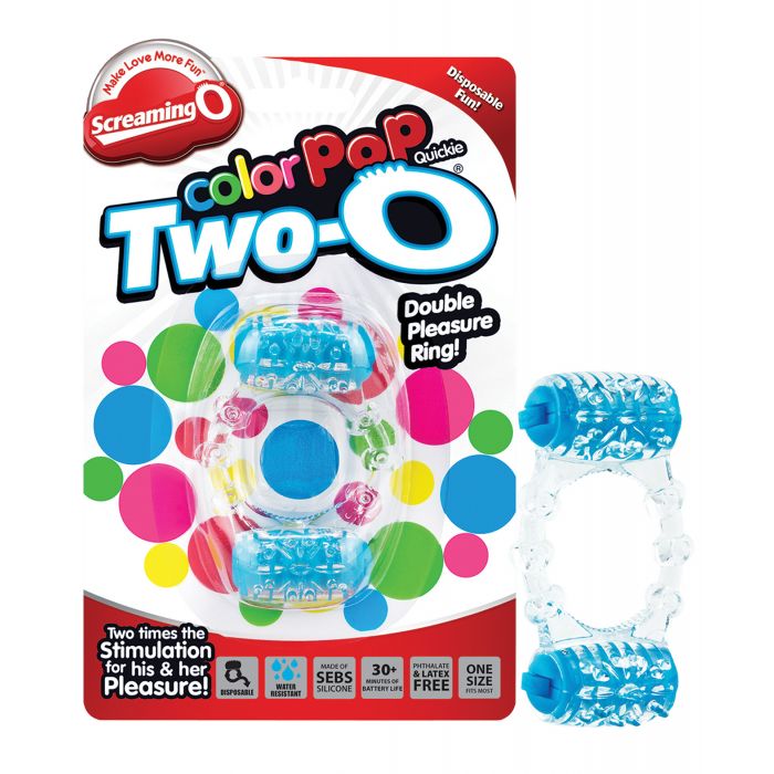 The Two-O Double Pleasure Ring features two super-powered, super-bright mini motors attached to a stretchy and comfortable pleasure ring for better, more satisfying sex. The top motor stimulates her clitoris while the bottom motor buzzes strong for mutual pleasure, giving couples something to scream about together! Now available as a convenient ColorPoP Quickie, couples can enjoy vibrant vibration at home or on the go with a disposable design they can take anywhere!
