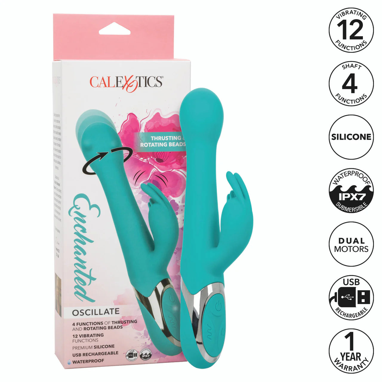 Enchanted Oscillate Green Rabbit Vibrator from California Exotic Novelties. Introducing the Enchanted Oscillate, a sophisticated and powerful dual stimulator that takes personal pleasure to new heights. Designed for those who seek a comprehensive and exhilarating experience, this product blends advanced technology with user friendly features, all while providing pleasure and fun. At the forefront of its design is the powerful thrusting and rotating beads in the head, complemented by a flickering teaser. This combination provides a dynamic and varied experience, catering to a wide range of preferences and desires. The head alone boasts 4 functions of thrusting and rotating beads, offering a unique sensation that sets this device apart in the world of personal pleasure products. In addition, the Enchanted Oscillate offers 12 functions of vibration, pulsation, and escalation in the stimulator. This variety ensures that every use can be a new adventure, with settings ranging from gentle whispers of pleasure to intense waves of ecstasy. Made with body safe Silicone and being 100% waterproof with an IPX7 rating, it invites exploration in various settings. User experience is enhanced by the state of the art memory chip, which resumes on the last function used, ensuring a seamless continuation of enjoyment. The easy push button control, complete with an instant on/off button and LED light, makes operation straightforward and hassle free. USB rechargeable, with a charging cord included, it offers convenience and readiness. A full charge in just 1.5 hours leads to 40 minutes of high speed action or 50 minutes at a lower speed, ensuring the Enchanted Oscillate is always ready for your next journey of pleasure.
