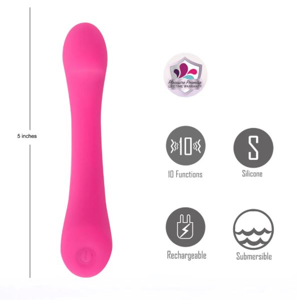 FEATURES: 100% Medical Grade Silicone, Rechargeable, 3-Speeds + 7 Variable Patterns, Length = 5-inch, Diameter 1-Inch, Insertable Length 3-1/2 Inch, Submersible, Charging Cable Included, Pleasure Promise Warranty.