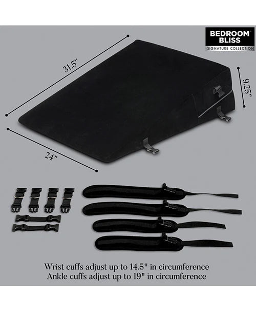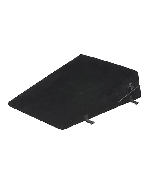 Find the perfect position with a little elevation from this body wedge and keep your partner there with the built-in clips for wrist or ankle restraints! This lightweight, high-density foam wedge is covered in a velvety soft outer layer and a water-resistant inner layer. It's firm enough to lift your entire body up and has enough softness to keep it sexy. Both inner and outer pillow covers are machine washable, too! You can enjoy losing your inhibitions and getting wild with this comfortable, supportive bondage wedge! This bondage pillow set includes 2 wrist cuffs, 2 ankle cuffs, 4 connectors with D-rings and 2 restraint connectors. There are also built-in clips for restraints or other accessories. Attach your lover's wrists and ankles to the pillow wedge. As they lay down or lean on the wedge, their own body weight becomes the anchor that keeps them bound. Lift up their hips for easy access to their G-spot or P-spot, turn them over and play with them in Doggy position, or support your own knees as you kneel on it with them! The velvety feel of the soft outer cover adds sensuality to your kinky session. The wedges are also lightweight so you can easily travel with them for overnight stays and parties!