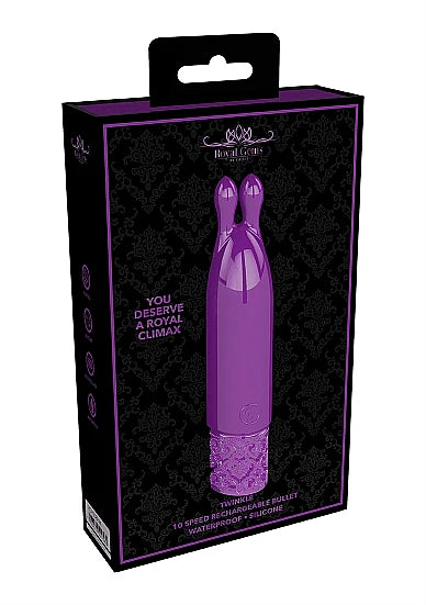 Royal Gems Twinkle Silicone Bullet Vibrator Rechargeable Purple from Shots Toys. You deserve a Royal Climax. Twinkle Rechargeable Silicone Bullet. Toy Brands: Shots - Royal Gems. Toy Genres: Luxury, Vibrators. Product number: ROY009PUR. EAN Code:7423522529577. You do not need to be royalty to enjoy this elegant line. Hidden beneath its silky smooth Medical Grade Silicone exterior lies a pedigree unmatched. Twinkle Bullet Vibrator has a special tip will tickle and tantalize all your special places. The magnetic fully rechargeable proprietary New Generation F-1 motor design delivers mind blowing vibrations uniformly across the full surface of the toy. Do not settle for the common, choose to be Royal.