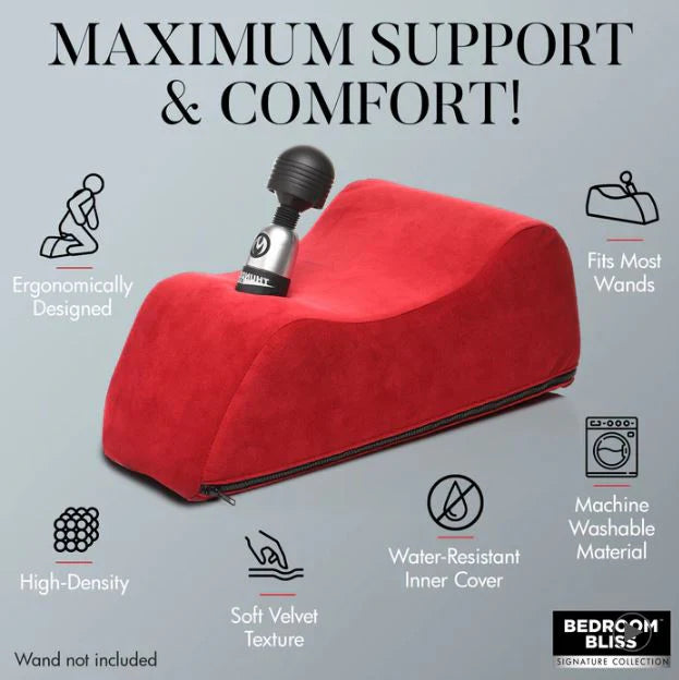With this high-density foam pillow, you get all the support you need while riding the edge of pleasure! This pillow is ergonomically designed to fully support your weight. The 7 inch deep, open-ended pocket fits nearly any wand vibrator so it stays in place as you enjoy hands-free stimulation! As a bonus, the soft outer cover and the water-resistant inner cover are both machine washable! Enjoy hands-free stimulation as you straddle the ultra soft pillow, effortlessly lifted up so you can enjoy your partner's passionate affections or angle yourself to ride the toy of your choosing as you indulge in solo-play! The toy pocket at the top fits most toys but is especially designed for wands, vibrators and dildos. Spice up your sex life and use a vibrator while getting penetrated by your partner! Place this high-density foam onto a bed, couch, bench or the floor. Harder surfaces give even more support for the pillow, but softer surfaces give padding to your knees. Grab your favorite toy and slip the base into the pocket. Then turn it on and use some lube as your begin to writhe and grind. Bring your partner in on the action, too! As they slip their hands around you body, they can enter you from behind, your body perfectly poised to receive them as you simultaneously buzz your most sensitive spots! Play around and have fun! Flip over and use the pillow to help them plow you deeper and hit the right angle! Lift up your hips, support your body and explore new positions all with this one formidable, foam pillow! Measurements: Length: 20 inches. Width: 11.5 inches, Height: 8 inches. Wand pocket: 7 inches in depth; top & bottom openings are 2 inches in diameter. Materials: Foam, polyester, nylon