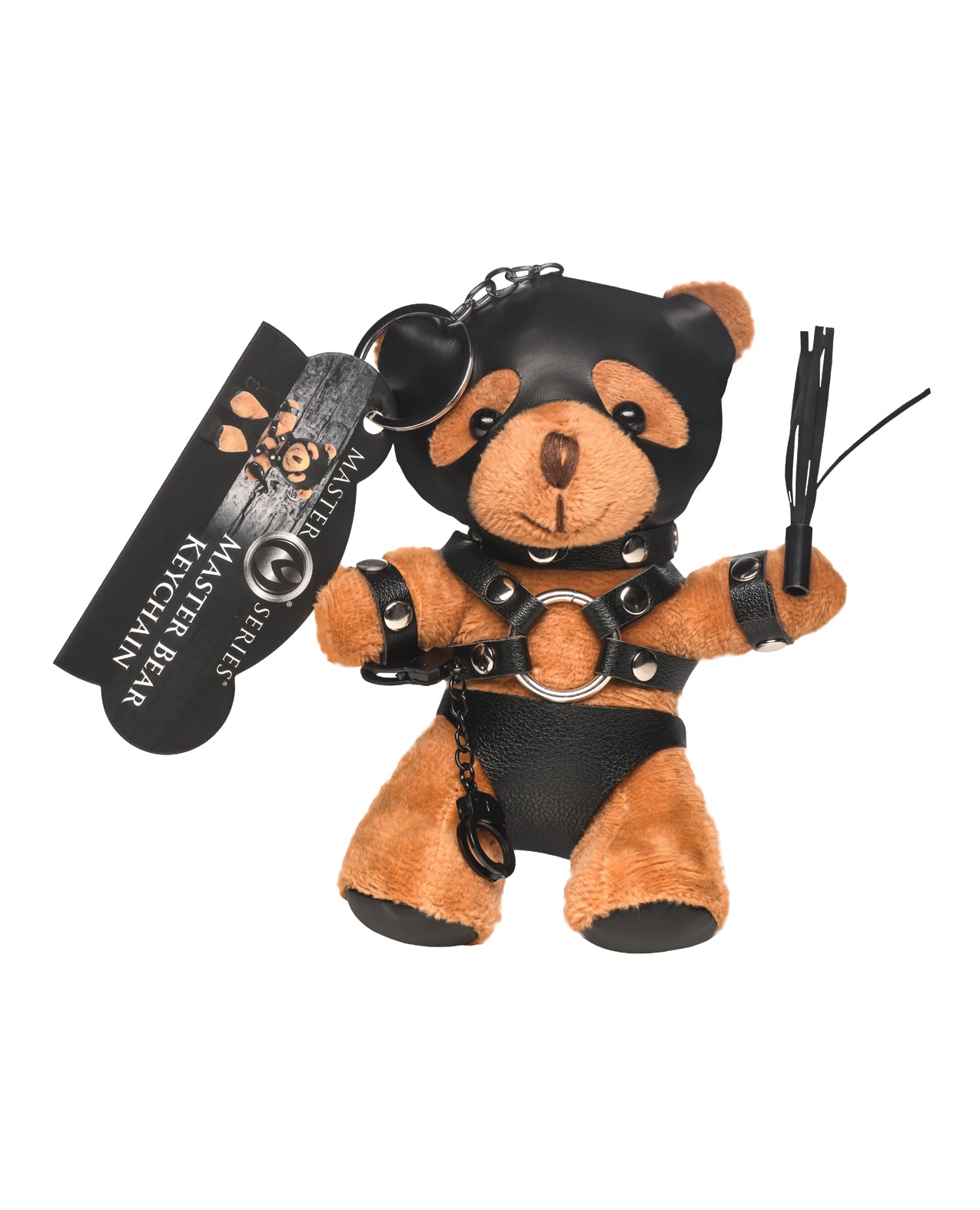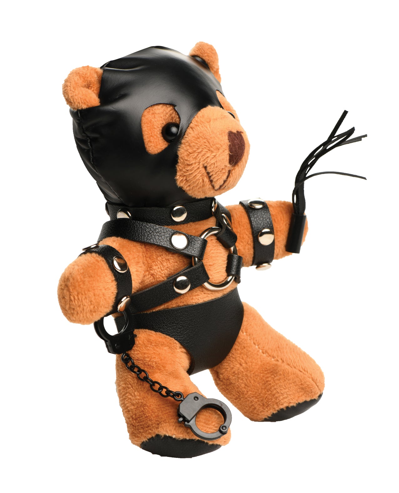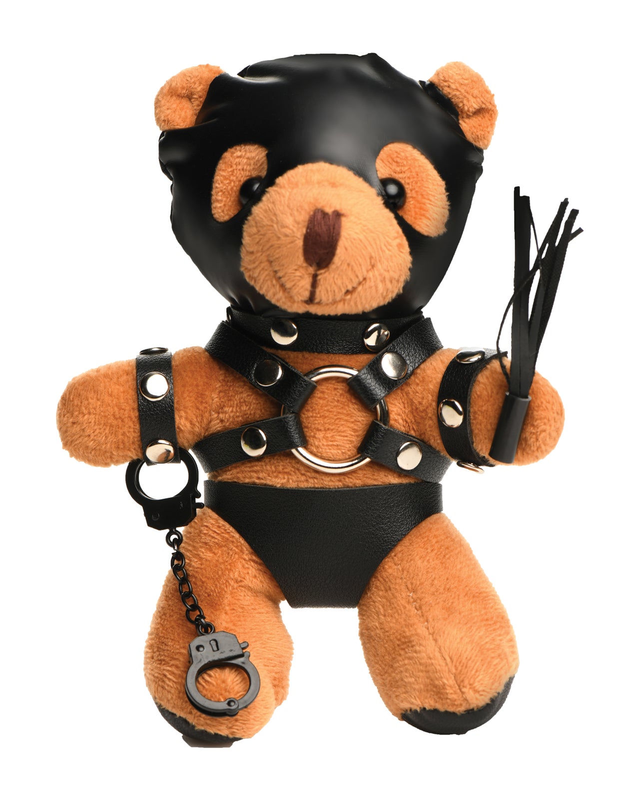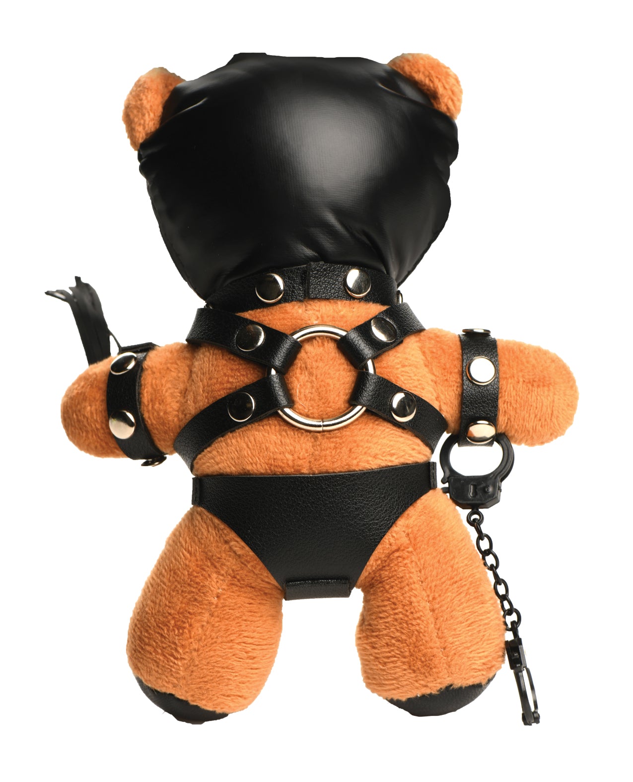 This charming plush bear has tan fur and is dressed in full bondage gear including a gimp-hood, harness, and underwear, complete with handcuffs and a flogger.