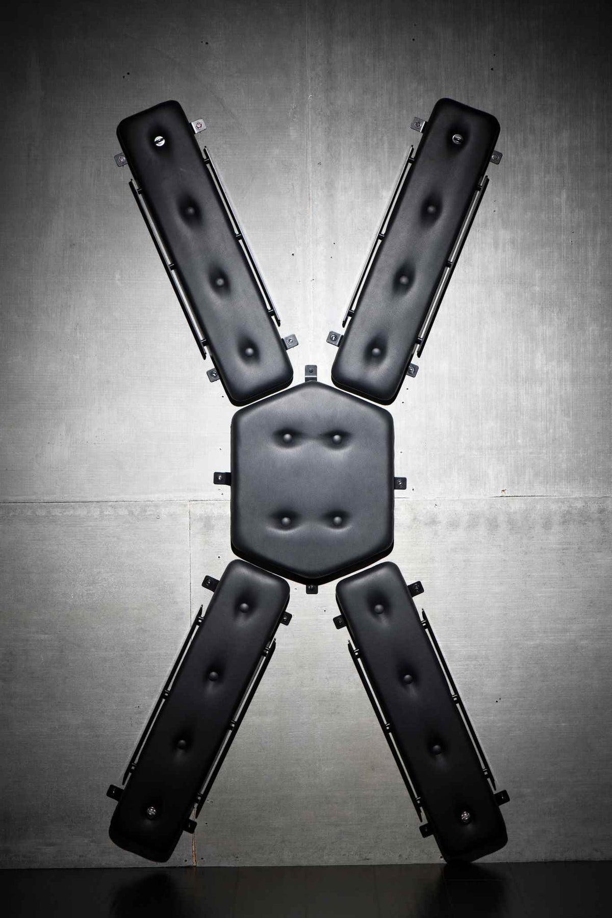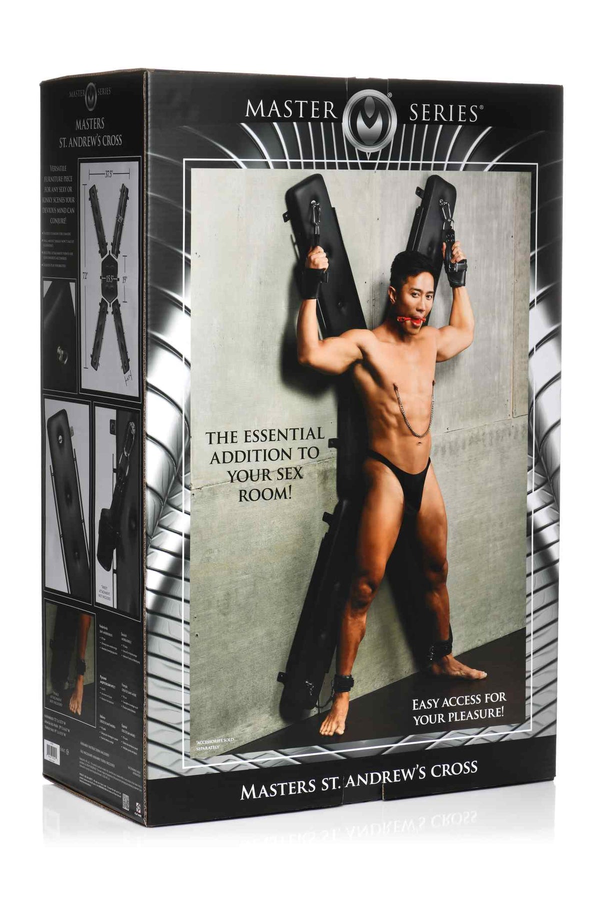 Master Series St. Andrew's Cross from XR Brands. Optimize your kinky play with this wall mounted St. Andrew's Cross! This plush, padded cross lays flat against the wall so you have more floor space! It is perfect for smaller rooms and gives you more square footage to place other kinky pieces in the room along with the cross. It is also great for rooms that have dual use such as a bedroom where you can hide a cross behind a curtain or dresser. The cross comes in 5 separate pieces and is shipped in a flat package discreetly to your address! Assemble it with the help of a drill and stud finder and place the 5 pieces exactly at the height that you prefer for easy and ergonomic scenes. The ultra plush pads are covered in PVC faux leather, are extra comfortable and easy to clean with a toy cleaner or isopropyl alcohol spray. Along the sides of each leg and arm pad are attachment points where you can attach wrist and ankle cuffs, rope, or other kink accessories! Get your submissive to stand upright for impact play whenever you like with this easy to install, easy to hide and compact St. Andrew's Cross! After mounting the cross securely to the wall of your choice, grab your favorite toys and kinky implements and place them nearby. After warming up your submissive, attach their wrists and ankles to the cross to keep them in place. You can have them facing forward or facing the wall. Once in place, feel free to use nipple clamps, floggers, whips, rope, gags and more! Your scene has just been amplified by a real St. Andrew's Cross in your sexy space! As you use the whips and floggers on them, you notice how much easier it is with a cross that does not take up much space! It allows you to have more room to use the impact tools and move around. When you are done with your scene, untie ropes or uncuff your submissive and bring them onto the bed, chair, couch or floor and give them some after care. Measurements: once assembled 72 inches length by 37.5 inches. Width arm and leg pads 29 inches, length 6.5 inches. Width Torso pad 19 inches length by 15.5 inches in width. Materials: PVC, Iron, Wood, Polyurethane PU. Color: Black. Note: screwdriver and 20 bolts are included. Set up will require a drill, drill bits and a stud finder. Key features: save on floor space! This upright St. Andrew's Cross lays flat against the wall so you can save on floorspace and it is easily hidden behind a dresser or curtains when not in use. Easily ships: five separate pieces are shipped flat and can be arranged any way you like to match your lover's height and torso once mounted on the wall. They can be rearranged in a way you prefer for a customized and optimal kink set up!