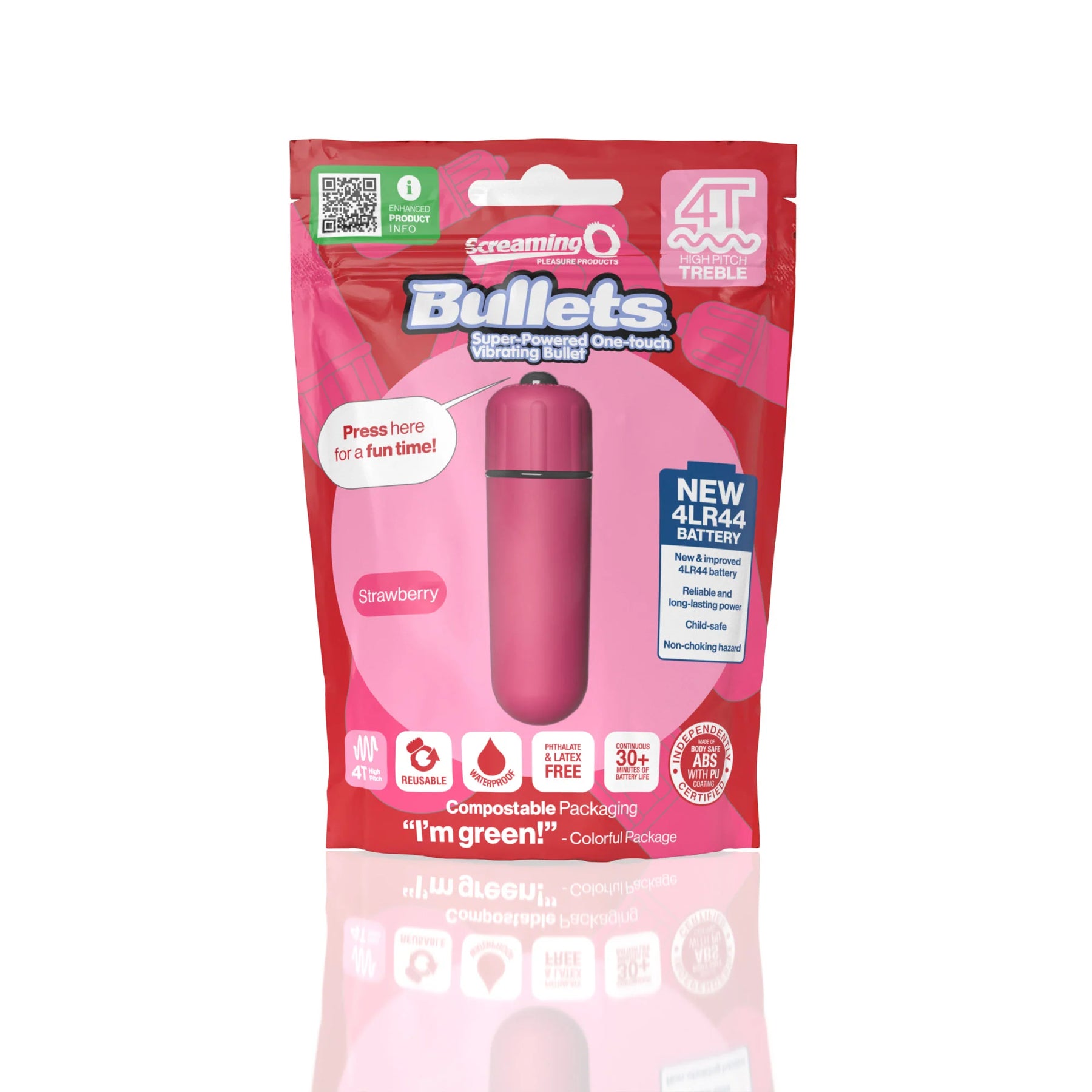 Screaming O 4T Bullet Vibrator Strawberry Pink High Pitch Treble Vibrating Bullet. 4T Bullet Vibrator. From the Screaming O Collection. Deep rumbling bass vibration. 5 speeds plus one pulse pattern bullet. Super powered Vibrating Bullet. Reusable. Waterproof vibrations for play outside the bedroom. Greener earth friendly packaging solution from Screaming O. Resealable zip top and made from ecological friendly, compostable materials. Featuring a new, better battery. New 4LR44 battery provides reliable and long lasting power. Child-safe. Non-choking hazard. How to use: twist turn cap to bullet vibrator. Remove tab. Hold down for 2 seconds to turn on vibrator. Continuous 30+ minutes of battery life. Independent certified made of body safe Silicone, SEBS ABS Plastic Bullet Vibrator. Deep rumbling vibrations. 5 speeds and 1 pulse pattern. Double rings for a secure fit. Categories: Vibrators, Bullets, Eggs Vibrators, One-Touch Bullets Vibrators, Classic Bullet Vibrator, Sex Toys for Women, Vibrating Bullets and Eggs. 2023.