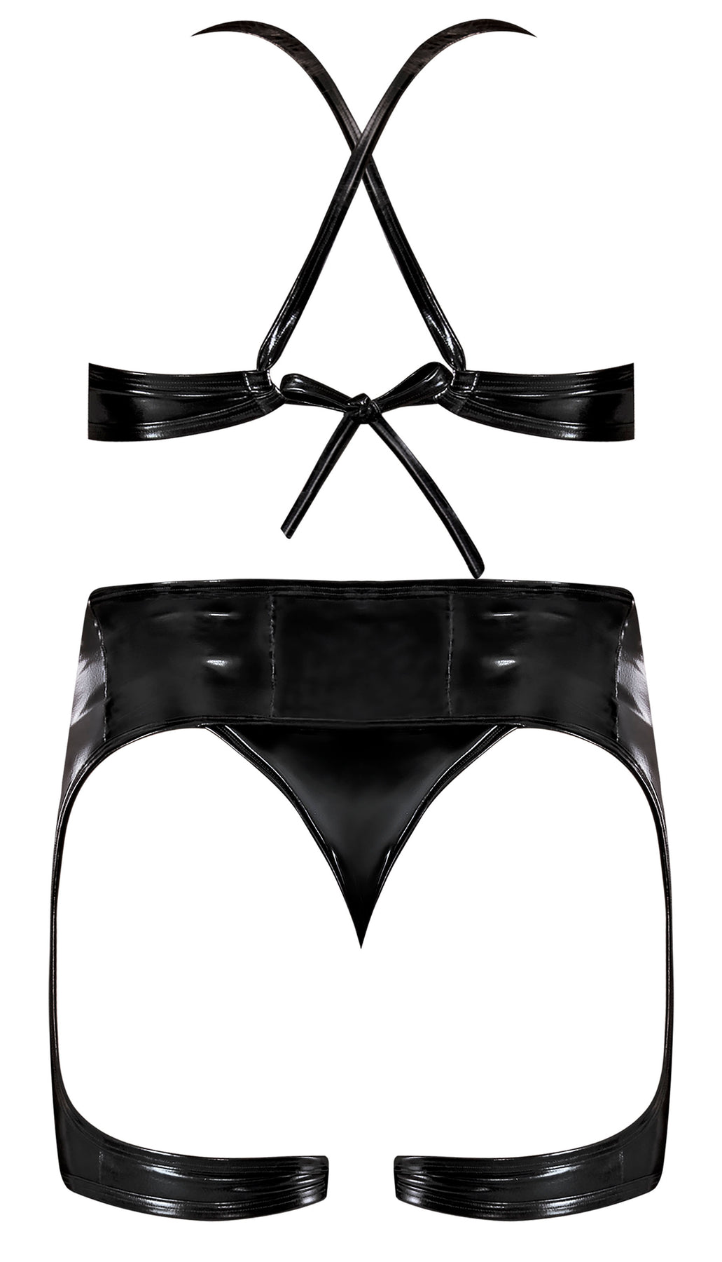 Liquid Onyx Bra, Waist Cincher and Panty Set Black L/XL from Magic Silk Lingerie. From the Exposed by Magic Silk collection, this style includes: a halter style bra with tie closure in the back, a matching stirrup cincher with zipper closure in the front and tie closure at the thighs, and a matching micro panty. Sleek wet look in jet black and provocative designs are the perfect match for a night of bedroom play. Fabric content: Polyester, Spandex. Ladies sizes L/XL large to extra large fits women dress sizes 12 to 18. Care: hand wash cold water. No bleach. Dry flat. Categories: Lingerie, Clothing, Bondage, Fetish, Kink, Bra Sets, Women's Underwear, Naughty Role Play. 2023.