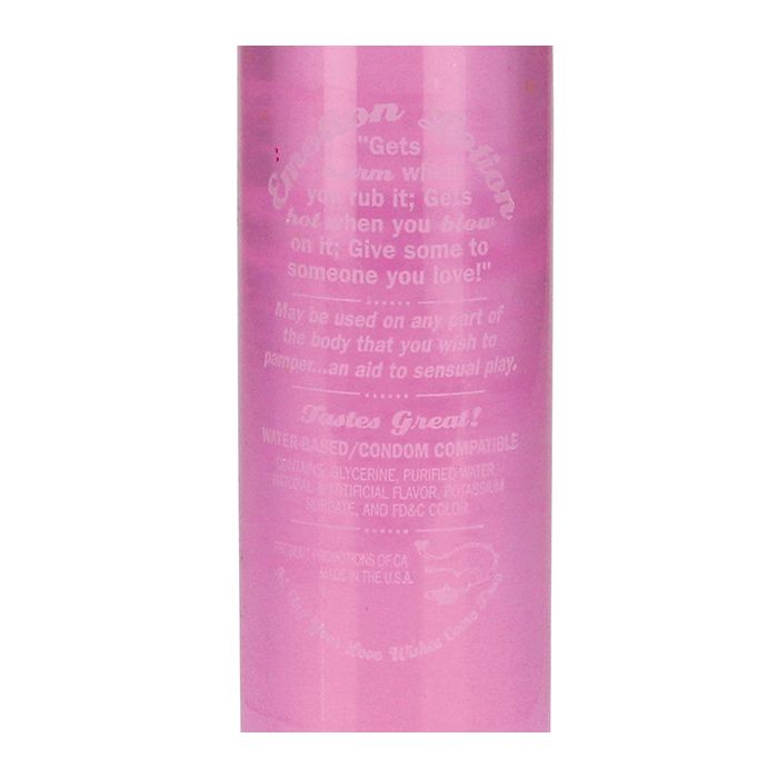 Emotion Lotion is a sweet, candy like massage oil that enhances erotic and sensual massage by making it tasty. Water based/ Easily washes away. Latex, Plastic & Rubber Compatible, 100% Food Grade Ingredients. This warming lotion gets warm when you rub it and hot when you blow on it. Give some to someone you love! Silky to the touch and enchanting to the taste, a whisper-soft blow on these delicately scented oils warms the skin with a tingly glow.