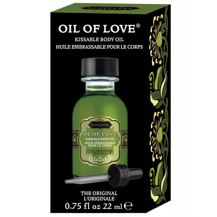 Kissable, water-based foreplay oil that gently warms on the skin. Use the included dropper to apply Oil of Love to the erogenous zones of the body, enjoying the sweet flavor. Not a massage oil or a lubricant. From Kama Sutra. How to use: Apply to an erogenous zone, lightly blow on the area to experience the gentle warming sensation, then kiss (or lick!) the product off the skin. Not a flavored lubricant. Oil of Love(R) is a kissable flavored formula designed for foreplay enhancement. ORIGINAL flavor has notes of creamy vanilla and warm chocolate with a hint of cinnamon.