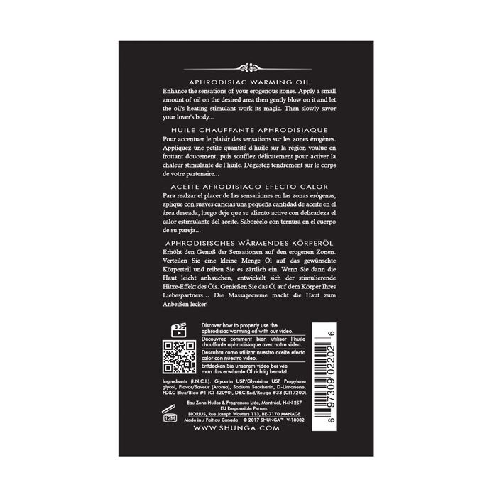 A delciious edible warming oil created especially to excite erogenous zones. Activate by the warm breath of soft intimate kisses. Perfect for use on the erogenous zones. Pour a small amount of the oil on the desired area and gently massage it into the skin. Softly blow on the oil to activate the product's heating properties. Use freely on any part of the body. Exotic Fruit Ingredients (I.N.C.I.): Glycerin USP/Glycerine USP, Propylene glycol, Flavor/Saveur (Aroma), Sodium Saccharin, D-Limonene, FD&C Blue/Bleu #1 (CI 42090), D&C Red/Rouge #33 (CI17200). .