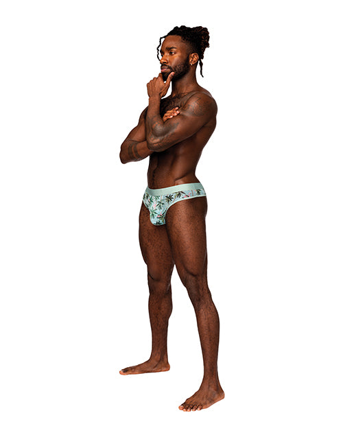 From the Sheer Prints collection by Male Power, the Seamless Sheer Thong features a double lined pouch, a tropical flamingo print and plush thin elastic waistband. One inch thong back and sides. Super fine poly spandex stretch mesh printed fabric, lightweight, sheer, and breathable. Fabric: 88% Polyester, 12% Spandex. Care: Hand wash separately, cold water, line dry, no bleach. S/M. Waist: 28in.-34in.