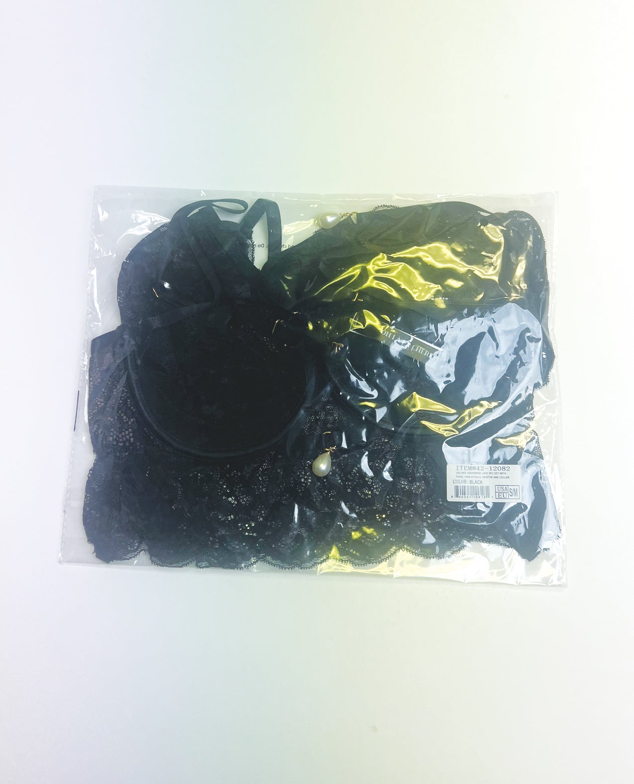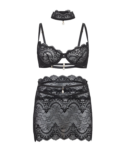 Perla Lace 3 pc Set w/Pearl Details - Black L/XL