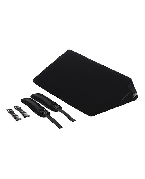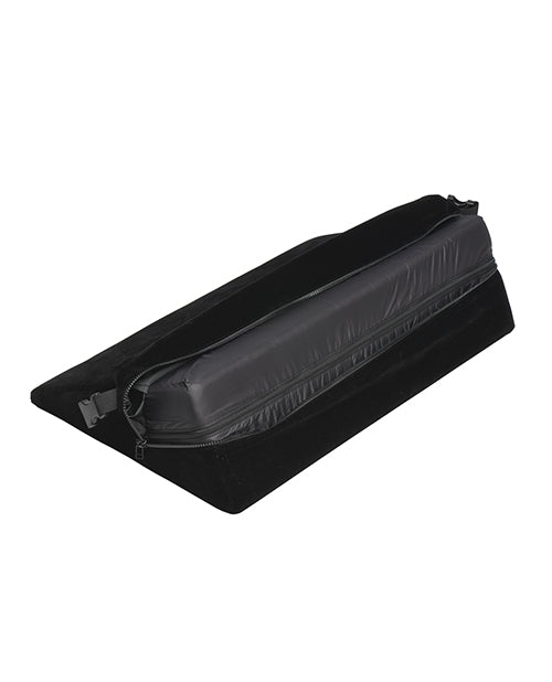 Find the perfect position with a little elevation from this wedge and keep your partner there with the built-in clips for wrist or ankle restraints! This lightweight, high-density foam wedge is covered in a velvety soft outer layer and a water-resistant inner layer. It's firm enough to lift you up and has enough softness to keep it sexy. Use it under your shoulders, chest, head, hips or knees to change the way you play! Both inner and outer pillow covers are machine washable, too! This kinky set includes 2 cuffs and connectors with D-rings and 2 restraint connectors so you can cuff your partner's ankles or wrists to the pillow. There are also built-in clips for restraints or other accessories. The soft outer layer keeps it sexy and sensual as your skin brushes against the fabric while the water-resistant, inner layer keeps your foam pillow moisture free! This velvet, black wedge goes great with any dark or neutral color decor, can be placed on your bed behind other pillows and used as support when you're sitting up, and is one of the simple yet essential pieces of your sexy bedroom collection! Use the pillow under your hips to tilt your pelvis and get greater access to hitting your G-spot or P-spot. Use it under your head for comfort and to lift the neck. Pad your knees as you pound your partner in Doggy style pose! Get on your side and use it between your shins or thighs to easily part your legs as your partner slips in behind you! At any time you can add cuffs or kinky bondage accessories to make it more interesting! Get fun and creative as you enjoy leveling up your love game!