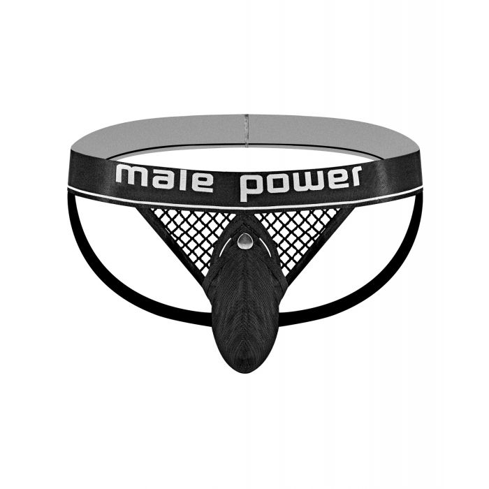 Cockpit fishnet Cock Ring Jock by Male Power. The emphasis is on the snap off pouch with built in elastic C-ring underneath. It is made with micro mesh for ultra-breathability, and attached with sturdy, nickel plated fasteners on top and bottom. They are easily removable in case of a passion emergency. The rest of this sexy lingerie is woven from stretch windowpane fishnet. S/M. Waist: 28in.-34in.