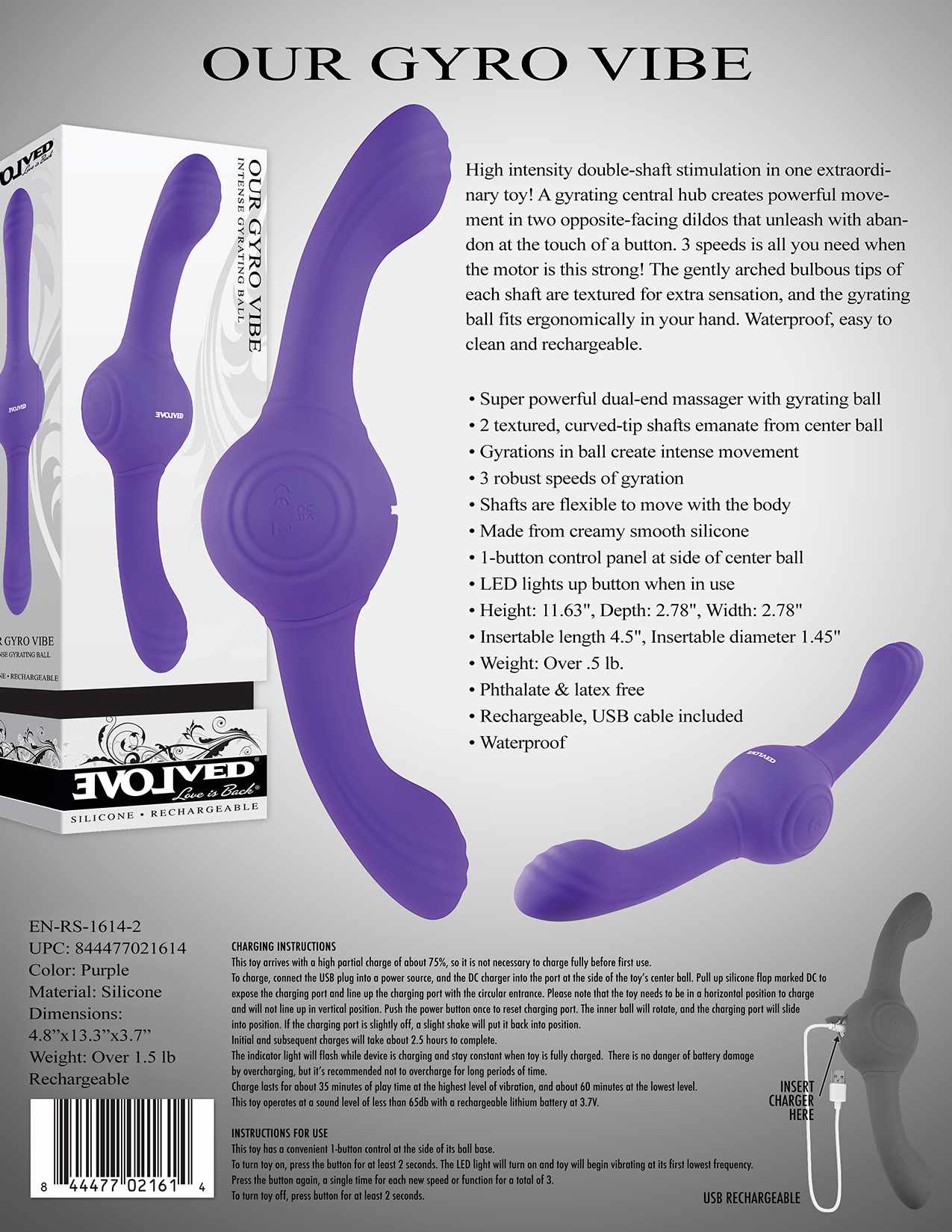 Evolved Our Gyro Vibe is a high intensity double shaft stimulation in one extraordinary toy! A gyrating central hub creates powerful movement in two opposite facing dildos that unleash with abandon at the touch of a button. 3 speeds is all you need when the motor is this strong! The gently arched bulbous tips of each shaft are textured for extra sensation, and the gyrating ball fits ergonomically in your hand. Waterproof, easy to clean and rechargeable.