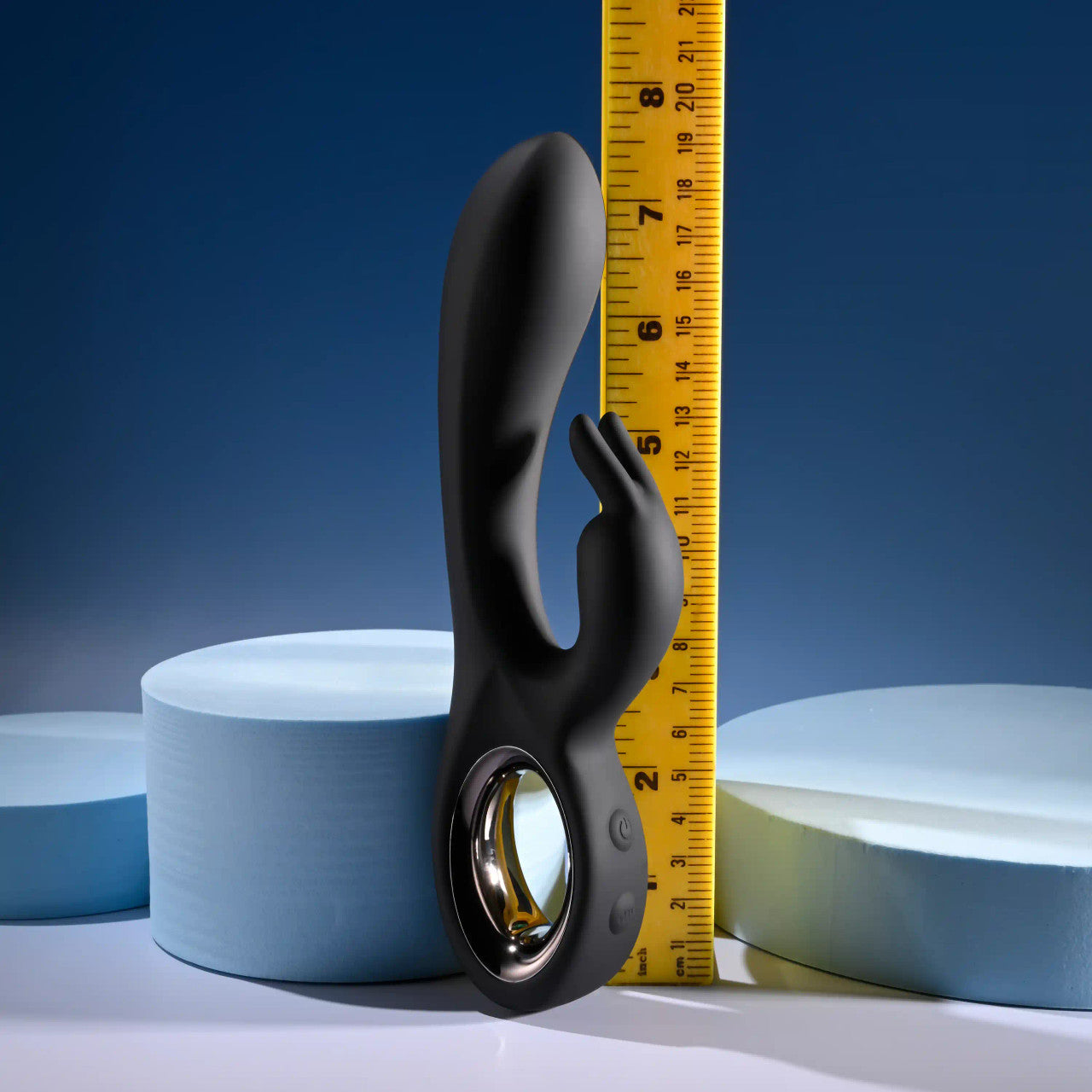 Late Night Bunny is the perfect excuse to call it a night! This powerful dual Vibrator is always ready for a late-night booty call with its 2 state-of-the-art motors that work independently for a custom dual experience – one in the gently curved swelling main shaft, and one in the hard-working rabbit. Made from sleek black body-safe silicone with a stylish and comfortable chrome ring handle, both shafts are flexible to move in harmony with your body. Discover the pleasures that await you after dark! Panel Details Play with me (key feature): Dual Vibrator Vibration: 10 speeds & rhythms, 2 motors controlled separately Material: Body-safe Silicone & ABS, Phthalate & Latex free Waterproof & Submersible: Yes Warranty: Five years Rechargeable: USB cable included Size Specs Height: 7.83”, Depth: 2.31", Width: 1.15" Insertable length 4.5”, Insertable diameter 1.36”
