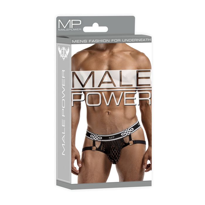 The Jock Ring from the Male Power PEEP SHOW collection features the decorative metal rings. Its made with plus elastic leg bands and the new Male Power logo in the waistband. This Jock is light as a feather with open weaving offering a peek a boo effect. 90% Nylon 10% Spandex. Black. S/M. Waist: 28"-34"