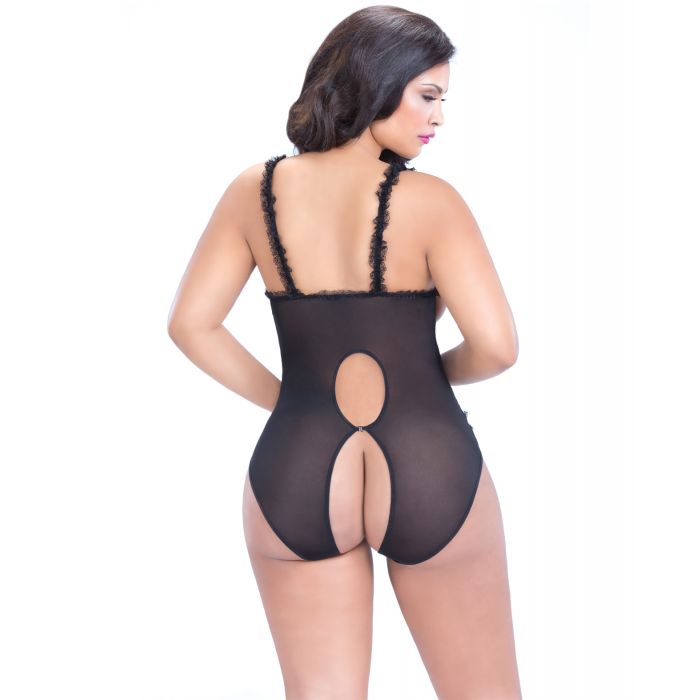 This sassy plus size lace teddy will make for a fun night in featuring open cups, ruffle spaghetti straps, mesh keyhole back and an open crotch.Fabric: 90% Polyester /10% Spandex.Queen: Cup D/DD, Bust 38"-44", Waist 32"-44",Hips 40"-54", Weight 160-250 lbs. Black . From Ohlalacheri.