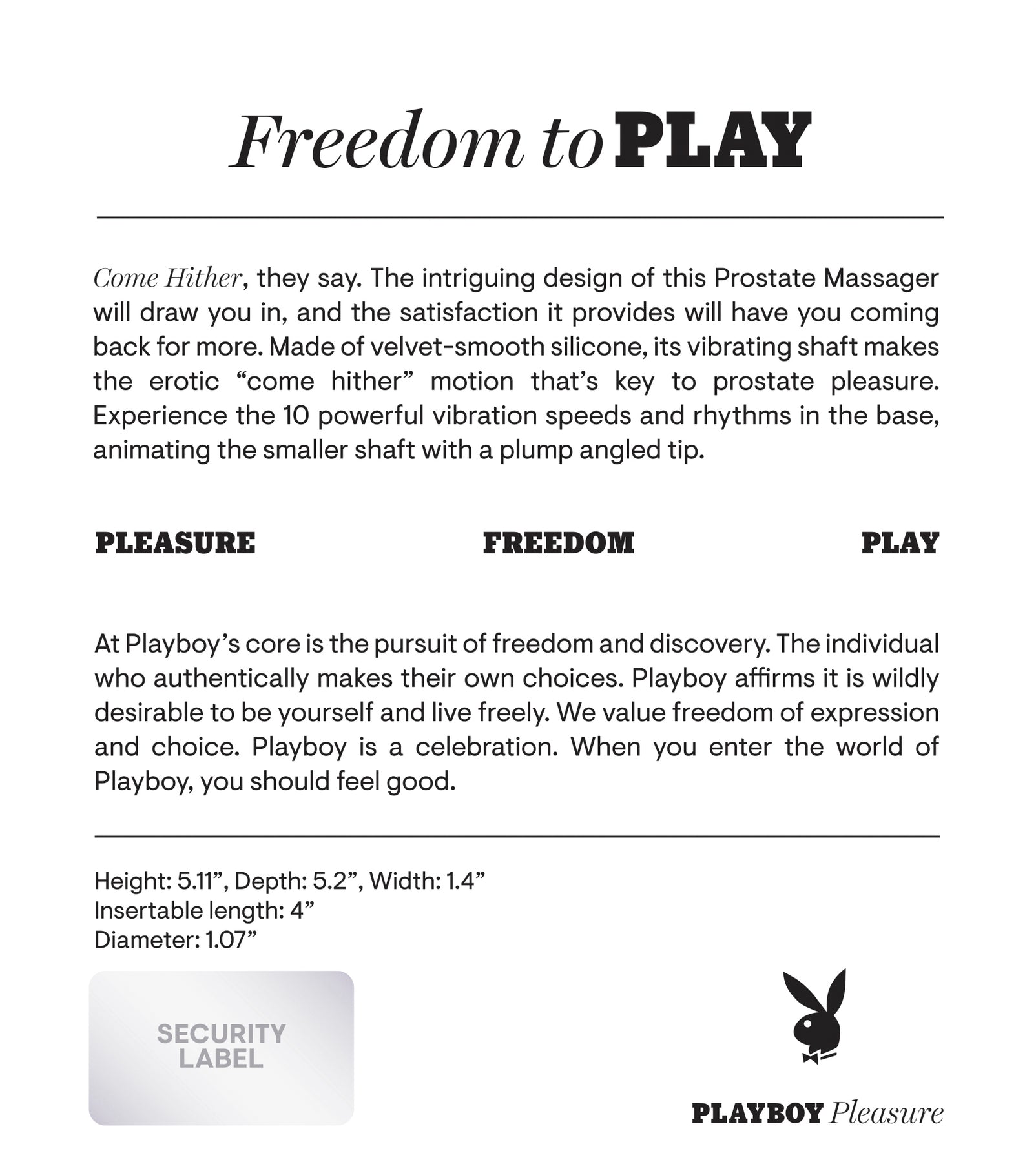 Specifications: vibrating Prostate shaft with unique Come Hither Motion. Materials: Body safe Silicone, Phthalate free, Latex free. Size: height 5.11 inches, depth 5.2 inches, width 1.4 inches. Insertion length 4 inches, diameter 1.07 inches. 10 vibration speeds and rhythms in base. 10 come hither motion speeds in head. Hold power button for 3 seconds to turn on/off. USB Rechargeable. Charging time 90 minutes. 60 minutes run time. Remote control included. 25 feet range. Remote control uses 1 CR 2032 battery. Waterproof vibrations. Submersible for easy cleaning and bathtub play. Care: always clean before and after use. Pat dry before storing. Only use a water based personal lubricant. 5 years manufacturer's warranty. Categories: Anal Toys, Prostate Massagers, P-Spot Stimulators, Vibrating Prostate Massagers, Vibrators, Sex Toys for Men, Rechargeable Vibrators. Play with me. Playboy and Rabbit Head design are registered trademarks of Playboy International. All rights reserved. 2023.