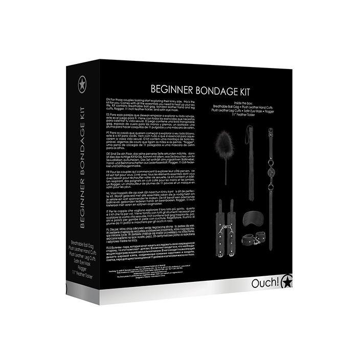 For those couples looking start exploring their kinky side, this is the kit for you. Comes with all the essesntials you need to heat up your sex life. Kit contains Breathable ball gag, bonded leather hand and leg cuffs, flogger, 11 inch feather tickler, and satin eye mask.