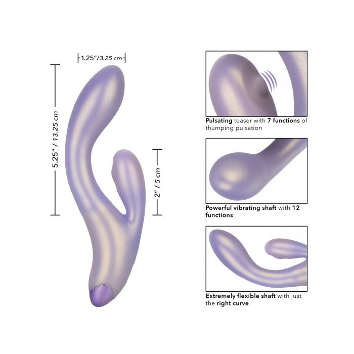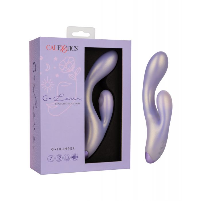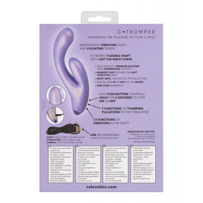 The gorgeous G-Love™ G-Thumper is a dual stimulating massager with vibrating shaft and thumping pulsation stimulator. Love yourself just right with the flexible G shaft, 7 independent functions of thumping action and 12 independent functions of vibrations. The thumping teaser tip and sensually curved shaft are perfect for teasing internal and external sweet spots. For an ultra smooth surface and flexible body, the curved stimulator and massager are covered in a shimmering Silicone. This silky smooth vibrator is packed with 12 functions of vibration and 7 independent functions of thumping stimulation made just for you. The high tech memory chip remembers just how you like it resumes play on the last function used. Whether you’re taking a dip with a lover or indulging in a steamy solo session, look forward to up to 55 minutes of waterproof vibration. Recharge pleasure and get back to playtime in only 2 hours with the provided USB cable. The flexible massager is made from a hygienically superior silicone. This body safe material is unscented and phthalate free to keep your most sensitive spots happy and healthy. 7.5" x 1.5" / 19cm x 3.75cm (Overall). 5.25" x 1.25" / 13.25cm x 3.25cm (Shaft). 2" x 1" / 5cm x 2.5cm (Stimulator). One Year Warranty.