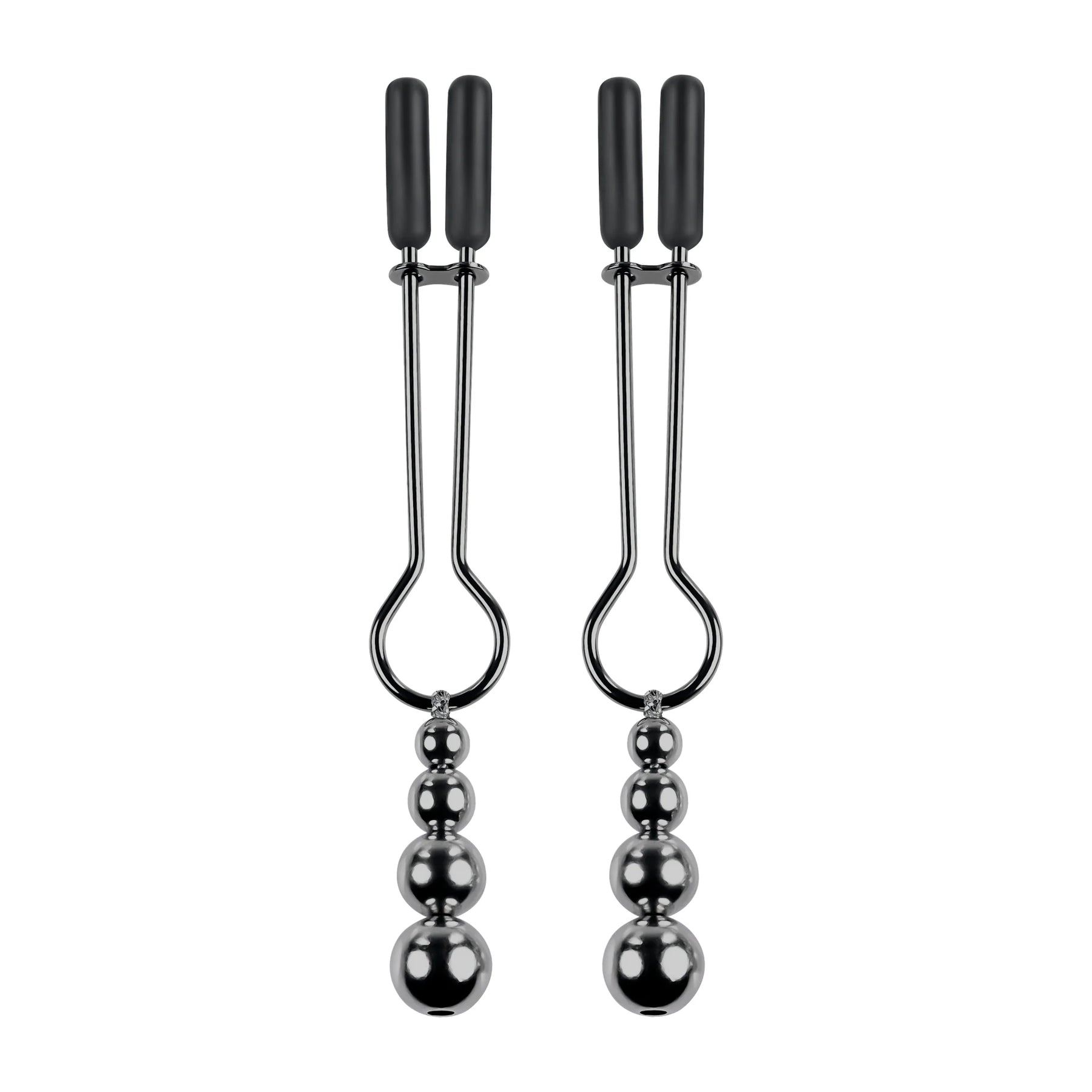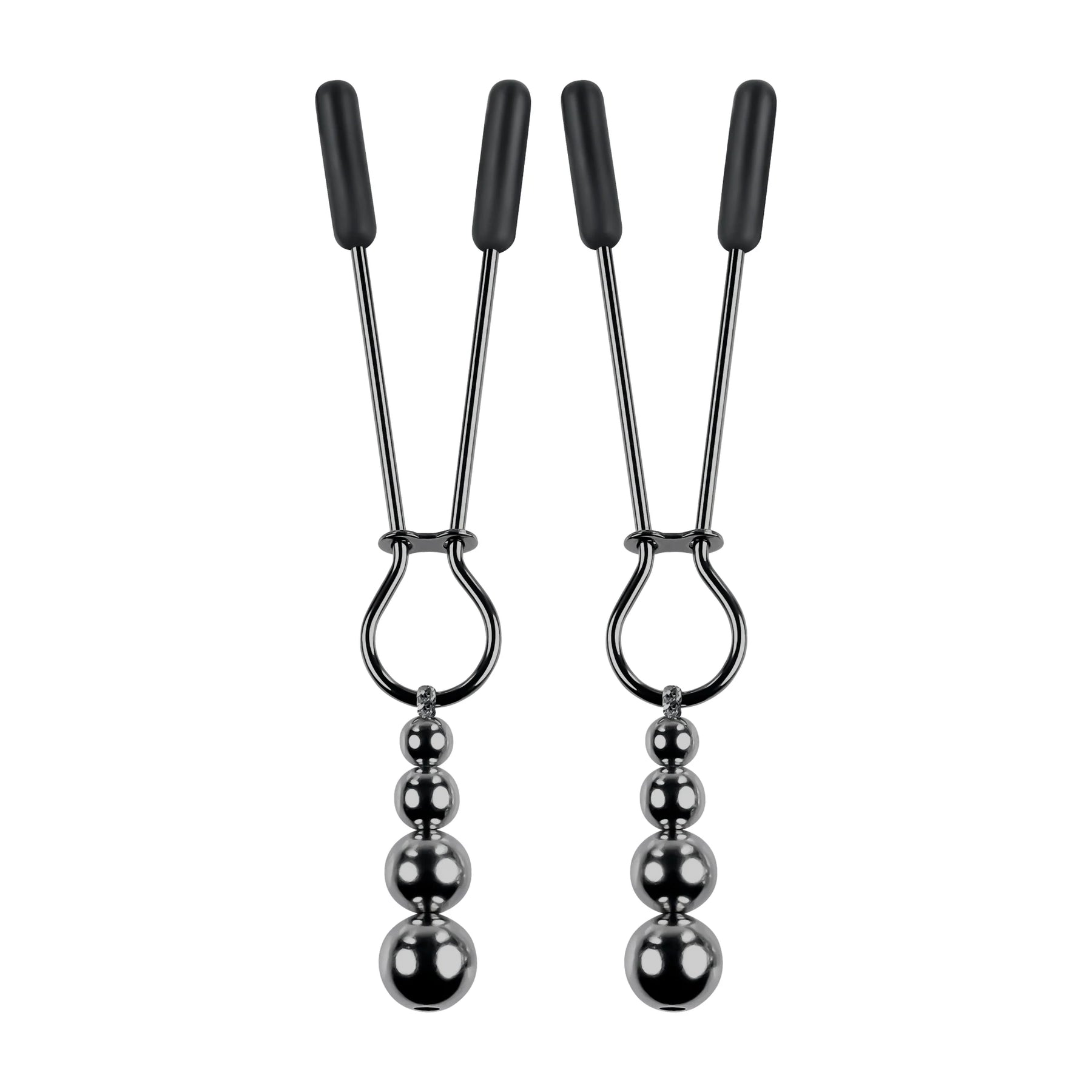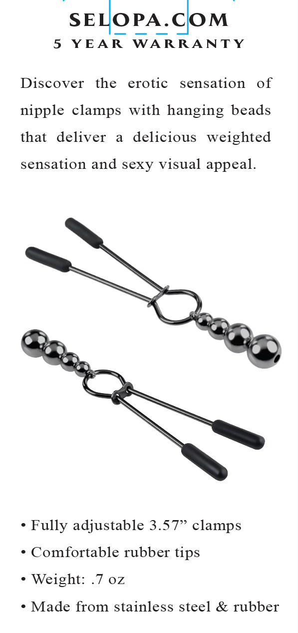 Selopa Beaded Nipple Clamps Black Chrome from Evolved Novelties. Love, sex passion. Discover the erotic sensation of Nipple Clamps with hanging beads that deliver a delicious weighted sensation and sexy visual appeal. Beaded Nipple Clamps specifications fully adjustable 3.57 inches clamps. Comfortable rubber tips. No painful piercing. Made from Stainless Steel and Rubber. Please note do not use oil based lubricant it can corrode the Steel. Categories: Bondage, Fetish, Kink, Nipple Play, Sex Toys for Women, Bondage Kits, Kinky Sets. 2023.