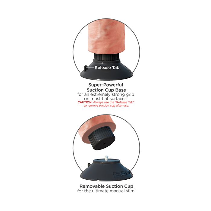 Do you want your first vibrator to look and feel just like the rock-hard stud you've always fantasized about? Stop dreaming and get down with the King! Proudly made in America, in Pipedream's state-of-the-art manufacturing facility, every King Cock is phthalate-free, latex-free, body-safe, and hypoallergenic. Every vein, every shaft, and every head is handcrafted with exquisite detail to give you the most realistic experience ever imagined. Featuring a posable spine, simply bend the cock to your favorite shape to hit just the right spot every time. Amp up the pleasure with a simple twist of the multi-speed dial for ultra-powerful vibrations that will blow you away. You can even take this waterproof vibe into the shower, hot tub, or spa and turn bath time into playtime! The super-strong suction cup base sticks to nearly any smooth, flat surface and offers harness compatibility for strap-on fun. Stick it to the floor, wall, tile, or bedpost and it will stay securely in place. Always use the release tab to remove the suction cup after use. The suction cup can be removed from the vibe by simply unscrewing it from the base for easier handling during manual play. Material: PVC Batteries: 3 AAA- not included Length: 8.5 in. - ( 22 cm ) Width: 1.9 in. - ( 48 mm ) Girth: 6 in. - ( 15 cm ) Insertable Length: 6.9 in. - ( 18 cm )