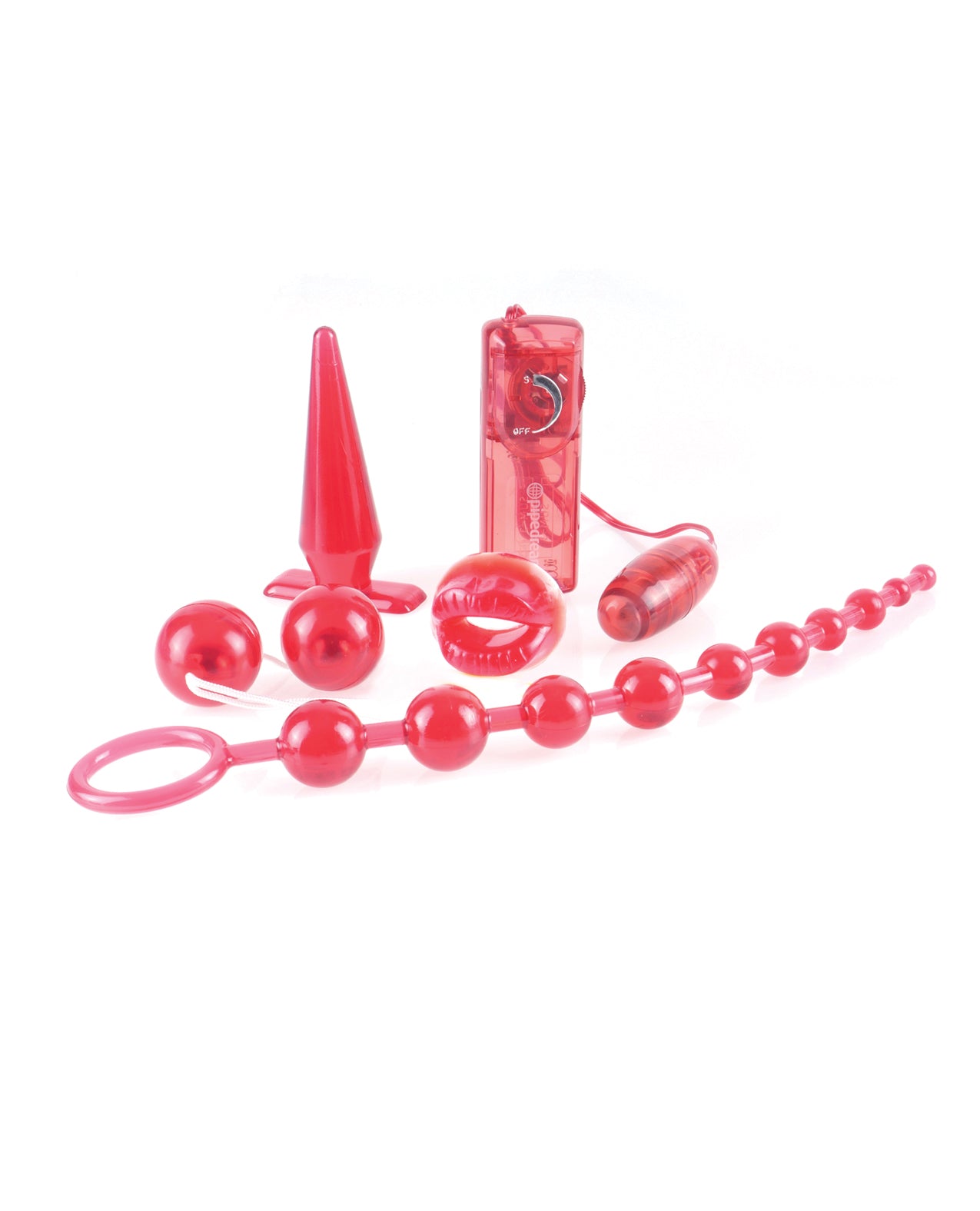 Take pleasure to the extreme! This incredible collection of wall-bangin' best sellers is sure to please. Everything you need for an evening of excitement is included: a waterproof multi-speed bullet, a slim multi-speed vibe, a jelly tapered butt plug, soft jelly sleeves and extensions, duo-tone balls, anal beads, and a super-stretchy cockring to make pleasure last. Get more bang for your buck and more variety!