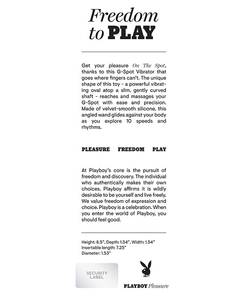 Get your pleasure On The Spot, thanks to this G-Spot Vibrator that goes where fingers can’t. The unique shape of this toy - a powerful vibrating oval atop a slim, gently curved shaft - reaches and massages your G-Spot with ease and precision. Made of velvet-smooth silicone, this angled wand glides against your body as you explore 10 speeds and rhythms.