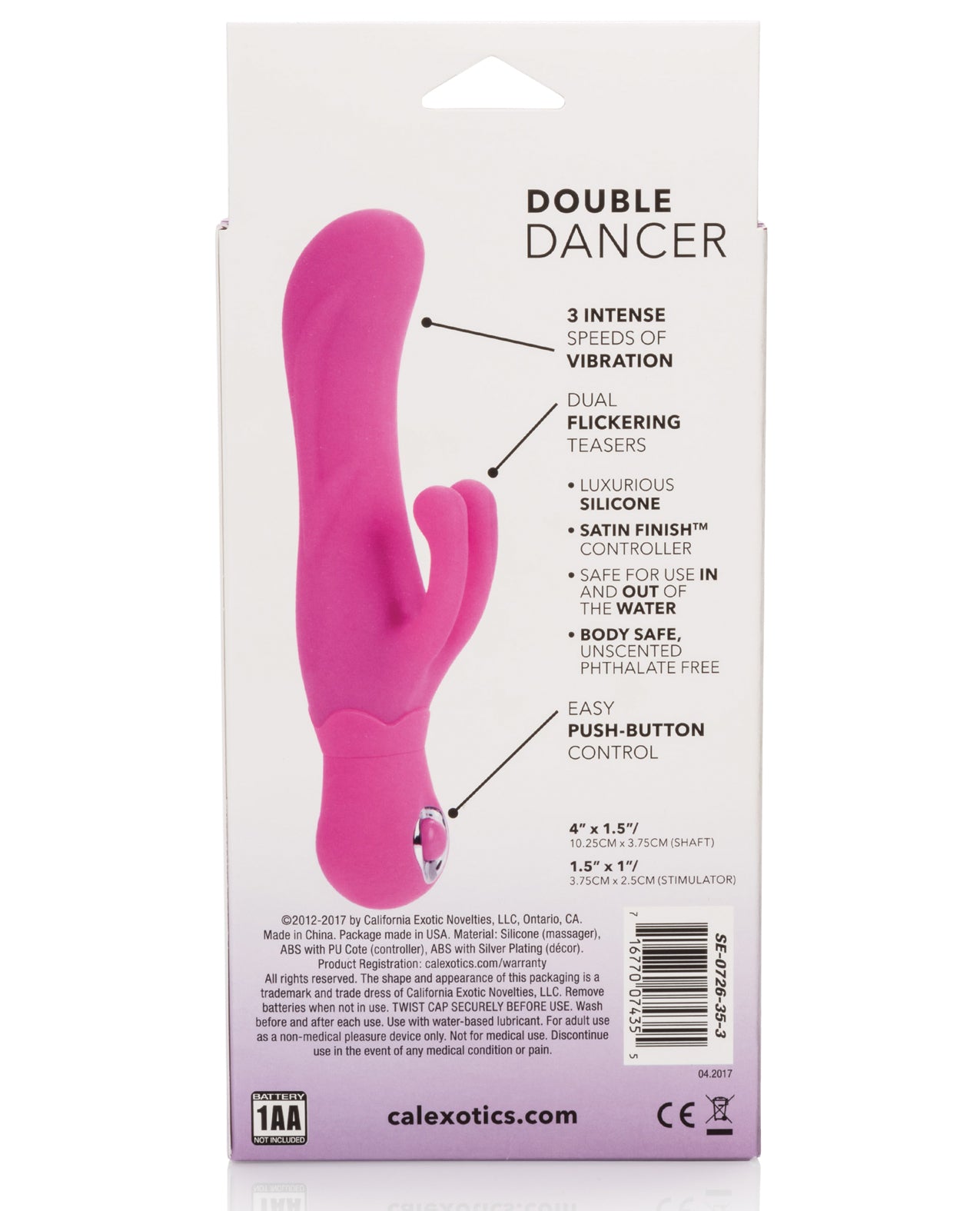 Your g-spot and clit have never been so happy. With the Posh Double Dancer, ultra-targeted sensation on your two most sensitive spots will send you spiraling into unbelievable bliss. This silky-soft, luxurious silicone massager provides dual stimulation for optimum pleasure. The unique, perfectly curved tip massages your g-spot while the pleasure-rippled shaft provides heavenly textured stimulation as you twist and thrust it to your heart’s content. At 4 inches long by 1.5 inches wide, the Posh Double Dancer is the perfect size to hit all the right spots while still fitting easily into your purse for fun anytime. What sets this distinctive massager apart is how it got its name: The Double Dancer features two clitoral massagers to surround your clit with tickling, teasing, and incredibly pleasing sensations. Your clit will feel like it’s in a nest of ecstasy by the time this powerful massager has encircled it with waves of pleasure. The Double Dancer is made of wonderfully smooth body-safe silicone and is totally waterproof for play in and out of the water. It features 3 powerful speeds of vibration and requires just 1 AA battery to get started. Then, press the button nestled inside the silver décor ring and get ready to lose yourself in incredible pleasure with the Posh Double Dancer.