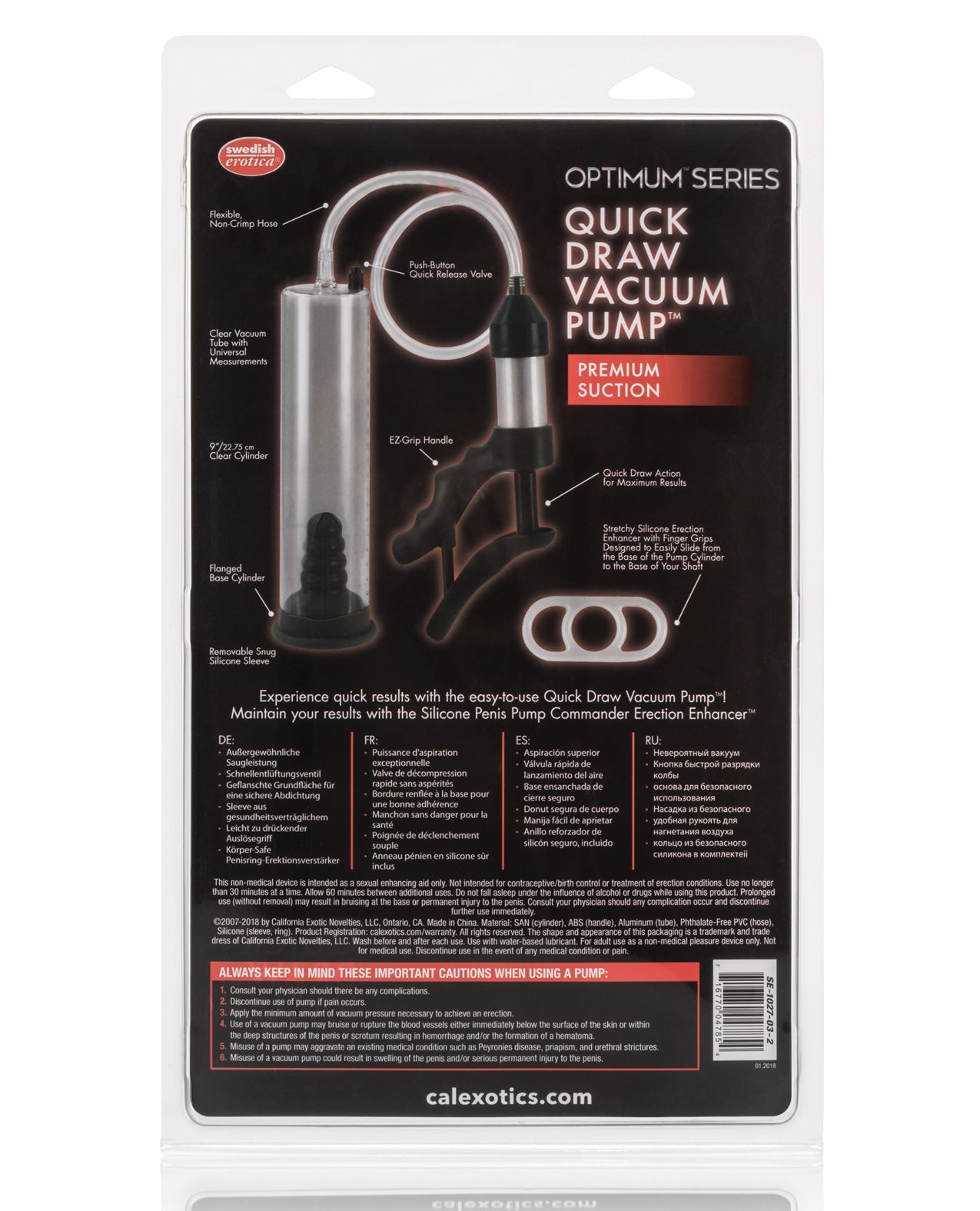 Maximum results with minimum effort are at your command with the Quick Draw Vacuum Pump. This high quality pump offers an incredibly strong vacuum and an easy to use design that will have you pumping up your size and your pleasure like never before. Thispump creates a super-strong vacuum seal with just a few quick pulls to maximize your results and make your pumping experience effortless. Thispump uses a vacuum seal to increase pressure and blood flow to your penis; over time, this allows your penis to expand in both length and girth and promotes firmer erections immediately. The pistol grip pump is easy to use. Just pull the “trigger” until you reach your ideal level of pressure and let the pump work its magic! When you’re finished pumping for the day, a push-button safety release valve breaks the vacuum seal in the cylinder immediately. A flexible and non-crimping hose makes pumping in any position simple. A removable and snug latex sleeve makes your pumping experience more comfortable and pleasurable than ever. When you’re looking to transition from pumping to play, the Silicone Commander erection enhancer slips easily from the base of the cylinder to the base of your shaft. Keep that hard-earned erection going without interruption with the stretchy, stamina-enhancing Commander. Handy finger grips on each side of the Silicone Commander allow for easy adjustment. The 9-inch-long and 2.1-inch-wide cylinder is ready to accommodate your growing penis. Experience a comfortable, pleasurable, and insanely effective pumping experience with this pump!