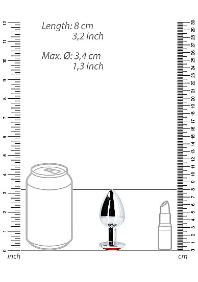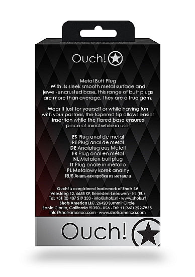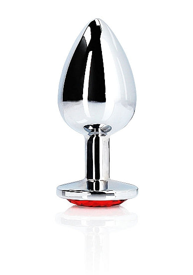 Ouch! Round Butt Plug Medium Silver Ruby Red from Shots Toys. Fetish brand of the year. With its sleek smooth metal surface and jewel encrusted base, this range of butt plugs are more than average, they are a true gem. Wear it just for yourself or while having fun with your partner, the tapered tip allows easier insertion while the flared base ensures piece of mind while in use. Enter a whole new world of sensations and stimulation, the world of temperature play combined with the beauty and pleasure of our Ouch! Aluminum Butt Plugs with Jewels.