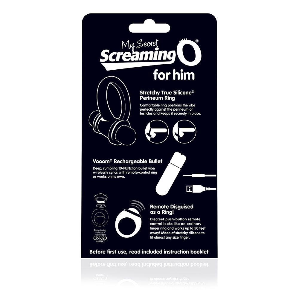 My Secret Screaming O Bullet and Ring for him for hands free perineum or testicle massage. Powered by deep rumbling Vooom vibration. 100% waterproof bullet vibe. Clever one size remote control disguised as a finger ring. Lab tested, body safe True Silicone cock ring and ABS plastic bullet vibrator. My Secret Screaming O Rechargeable Bullet and Ring for Him makes it easy to play in public with a compact rechargeable waterproof bullet vibe that positions perfectly against the perineum or testicles (your choice!). This USB rechargeable mini vibe comes with a clever remote control that looks like an ordinary finger ring, so you can enjoy hands free fun on your own or wear it out on the town. You can even try it with a partner and watch each other quiver from across the room. This remote operated vibe works from up to 50 feet away! Powered by deep rumbling Vooom vibration, My Secret Screaming O Rechargeable Bullet and Ring for Him is positioned at the perfect angle with a wide stretchy True Silicone ring to keep it in place. With little to no constriction at all, users can comfortably wear the sling around their penis and testicles and choose from two different pleasure experiences: Wear the bullet facing away from the body for testicle massage or angle it toward the body for perineum massage, you get to choose what kind of hands free fun you feel like having! My Secret Screaming O Rechargeable Bullet and Ring is powered by a 150mAh rechargeable battery for more than 60 minutes of rumbling bliss and boasts 10 functions of rumbling vibration that work with or without the remote control. The discreet remote control is made of soft and stretchy silicone to fit most fingers. New video. 2021.