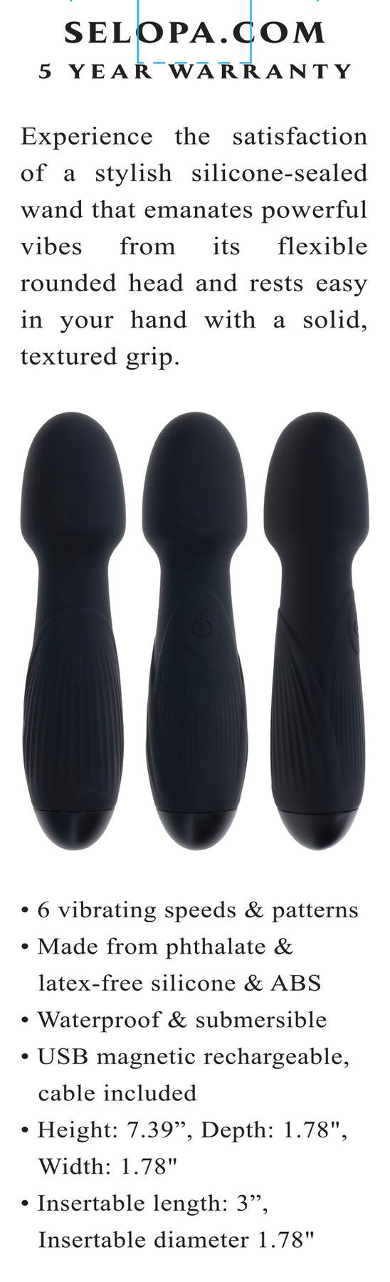Experience the satisfaction of a stylish Silicone sealed wand that emanates powerful vibes from its flexible rounded head and rests easy in your hand with a solid, textured grip.