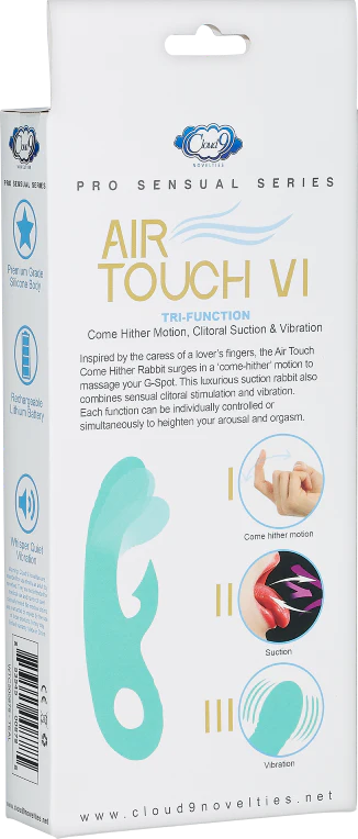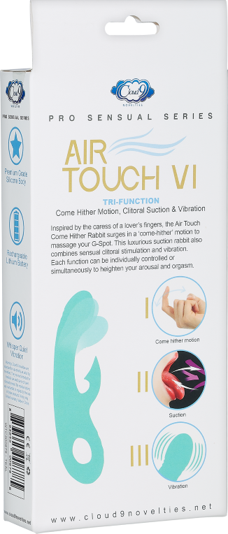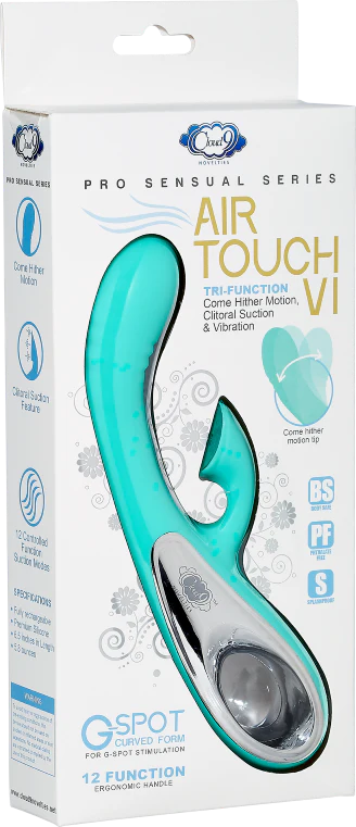 Pro Sensual Air Touch VI G Spot Come Hither Motion Rabbit Dual Function Clitoral Suction Teal from Cloud 9 Novelties. Inspired by the caress of a lover’s fingers, the Air Touch Come Hither Rabbit surges in a come hither motion to massage your G-Spot. This luxurious suction rabbit also combines sensual clitoral suction stimulation and 12 levels of vibration. Each function can be individually controlled or used simultaneously to heighten your arousal and orgasm. This Cloud 9 Pro Sensual series has three distinct functions including Come Hither Motion, Clitoral stimulation and vibration in one device. This device includes an ergonomically curved form designed for exact G-Spot Stimulation. Ergonomic handle is easy to hold in place during use with your fingers as the device is inserted towards your body.