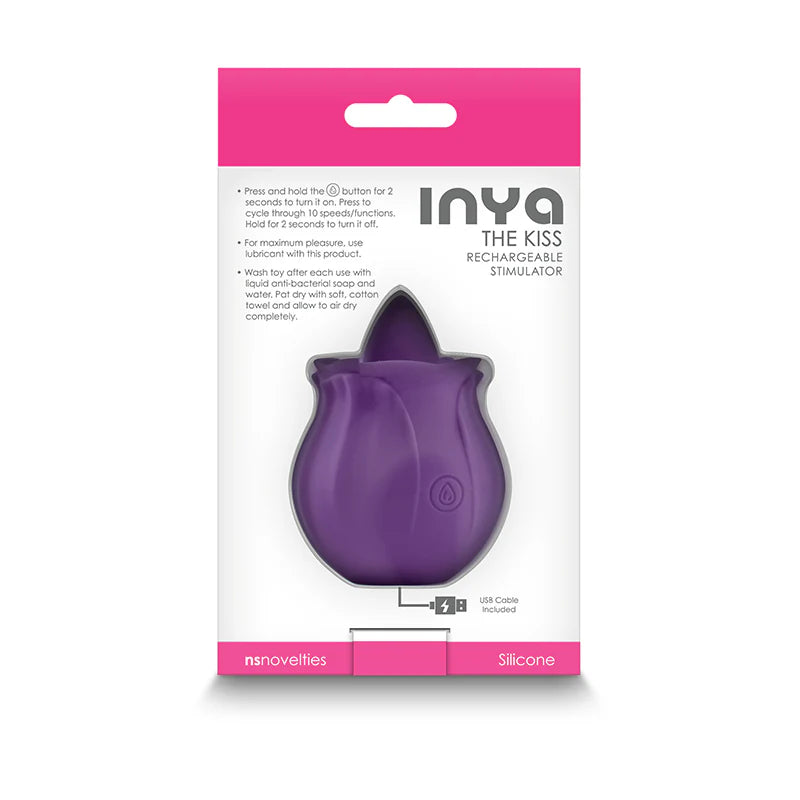 Inya The Kiss Purple Tongue Vibrator from NS Novelties. The Kiss Vibrator by NS Novelties. Inya is beautifully crafted in an eye catching rose bud design, the Kiss stimulates the clitoris with rapid tongue vibrations for an intense climax. Made of soft Silicone, it is rechargeable and travel friendly. Wash after each use. with liquid anti-bacterial soap and water. Pat dry with a soft cotton towel. Allow to dry completely before storing. For maximum pleasure use a water based personal lubricant with the Kiss Vibrator.