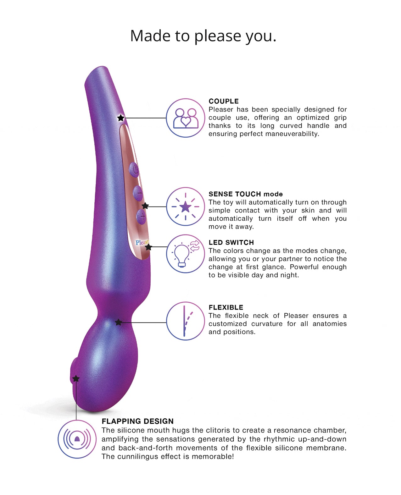 Pleaser is the rockstar of wands, the pleasure maestro, the little genius of Flapping Design. Its silicone membrane dancing wildly on your clit, reinventing the oral experience like never before. This is sensory art— with 5 modes and 8 intensities each, taking you from gentle tingles to full-blown, mind-melting tsunamis of pleasure.