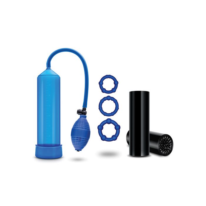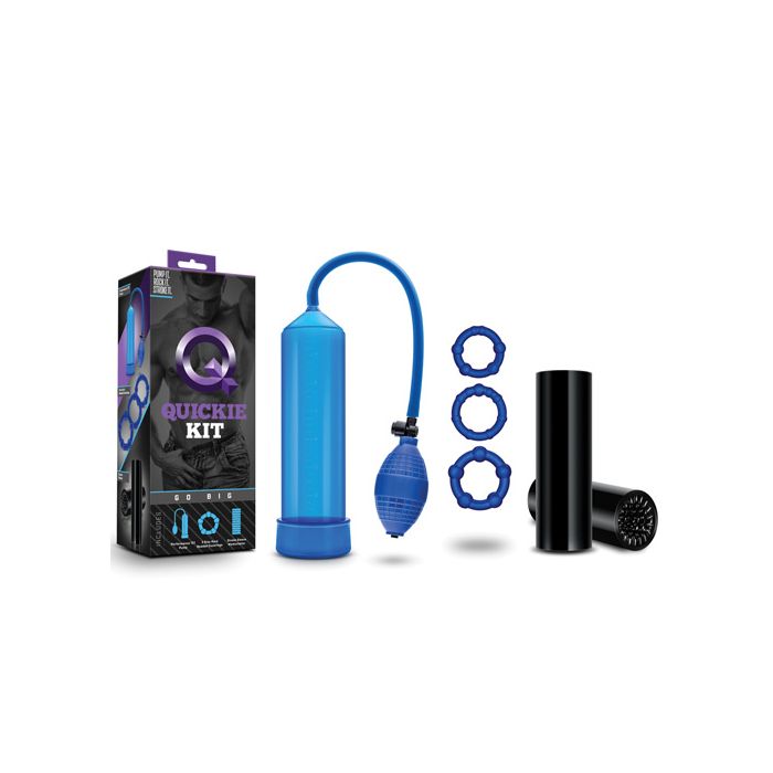 Explore new sensations with the strong suction of the squeeze ball pump, with an 8-inch chamber, flexible silicone tube, and quick release valve ensure maximum comfort. Or work your shaft with the soft, flexible stroke sleeve. Featuring loads of sensation from the ticklers and ribbed walls to engulf your penis, plus it's open-ended for easy clean-up. This Go Big Quickie Kit also includes three beaded cock rings! These flexible rings can be worn separately or all at once and can stretch to fit around the balls too. All products are made of body safe materials for your comfort and safety.