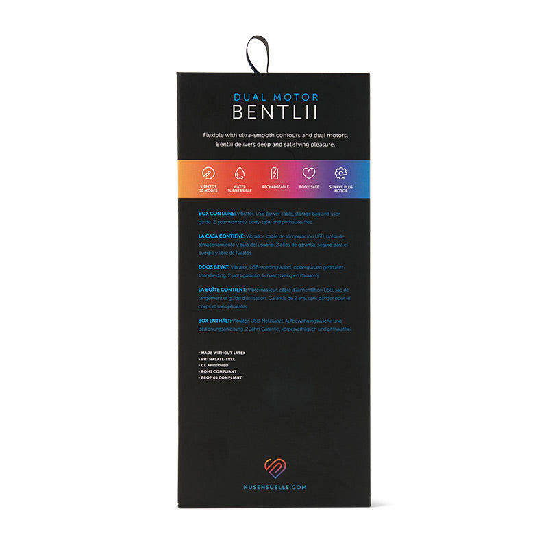 NU Sensuelle Bentlii 15 Function Double Motor Vibrator Magenta Pink. Deep and satisfying pleasure. 5 speeds + 10 pulsations. Designed for G-Spot stimulation and Clitoral play. S-Wave Plus motor. Power level: 6. Motor sensation: intense + gyration. Rechargeable vibrators. Water submersible. Body safe. Hidden beneath Bentlii's simple silhouette are two powerful S-Wave Plus motors. Each motor commands 15 unique vibrations, and Bentlii is programmed with a backtrack function to help users revisit the previous mode effortlessly. Bentlii's dual oscillating motors are so efficient that squeezing a memorable orgasm into your jam packed day has never been easier.
