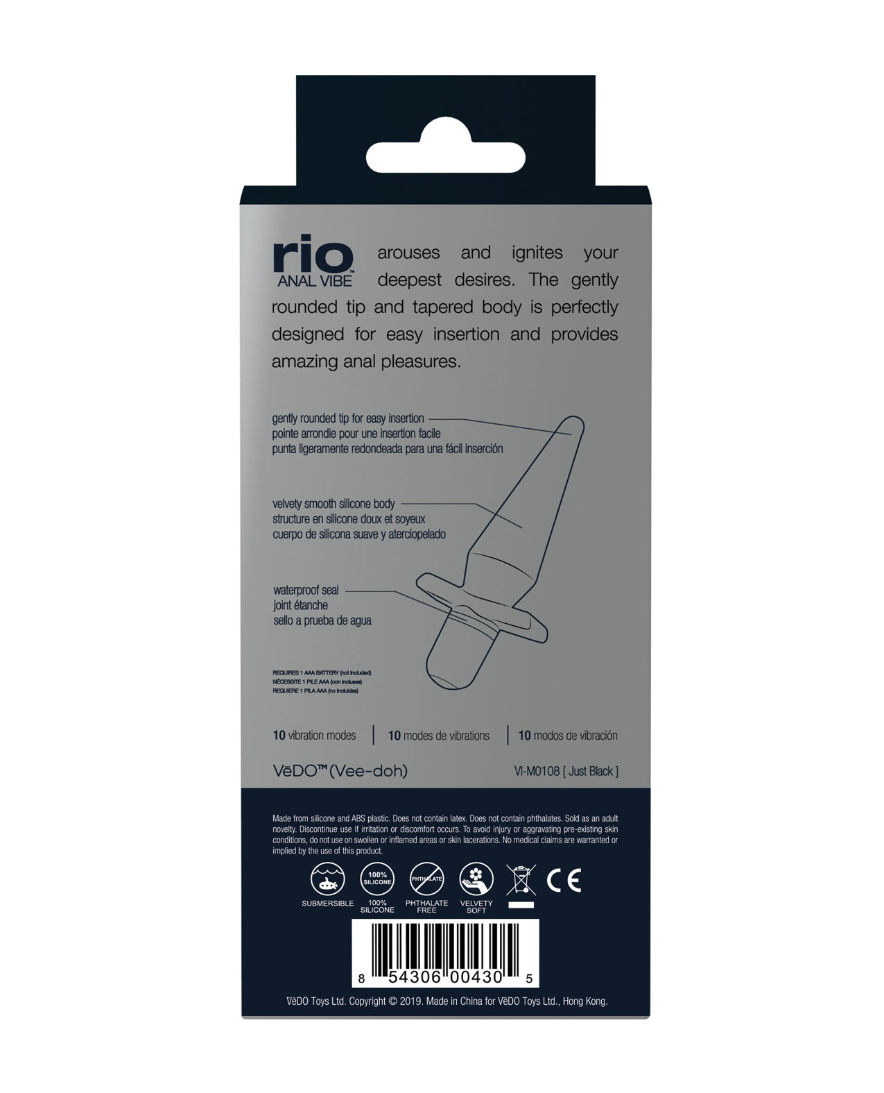 VeDO Rio ANAL VIBE arouses and ignites your deepest desires. The gently rounded tip and tapered body is perfectly designed for easy insertion and provides amazing anal pleasures. Powerful motor. 10 vibration modes. One button easy control(TM). Extremely quiet. Designed for an easy insertion. Waterproof - submersible. 1xAAA (not included). Running time 2 hours. Length: 13.5cm. Max diameter: 3cm. • 100% Silicone • 100% Phthalates Free • One Year Warranty