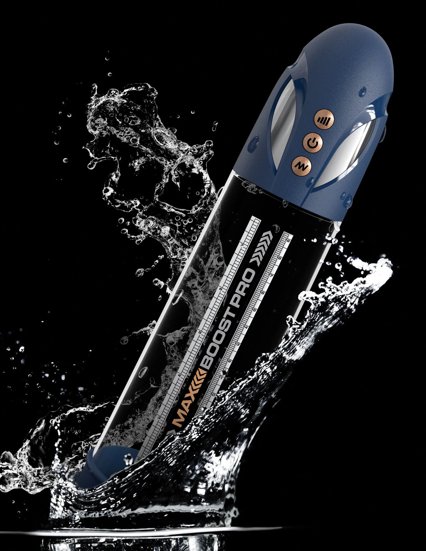 Max Boost Pro Flow Blue Clear Rechargeable Power Pump from Pipedream Products. Elevate Your Performance and Reclaim Confidence! Experience the power of automatic results while potentially unleashing stronger, more powerful, and longer lasting erections with the Max Boost Pro Flow Penis Pump! This revolutionary power pump has a completely waterproof IPX6 rating, meaning unlike other power pumps on the market, it can be used in the shower, tub, or spa and can even be filled with water without you having to manually pump up the pressure. Simply sit back and relax and let the Pro Flow do all the work. Choose from four constant suction speeds, four automatic suck and release pattern settings, or a manual pump mode, all built into the in line waterproof rechargeable pump.The bright LEDs change from green, to yellow, to red, indicating the amount of pressure inside of the tube and the LEDs can be turned off if so desired. Just imagine unlocking new levels of intimacy and the satisfaction of heightened pleasure for both you and your partner.