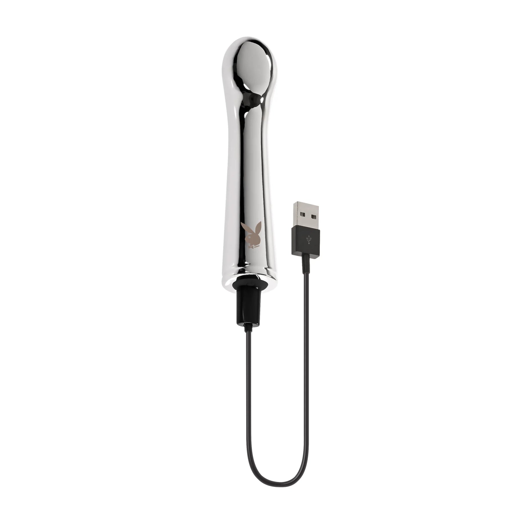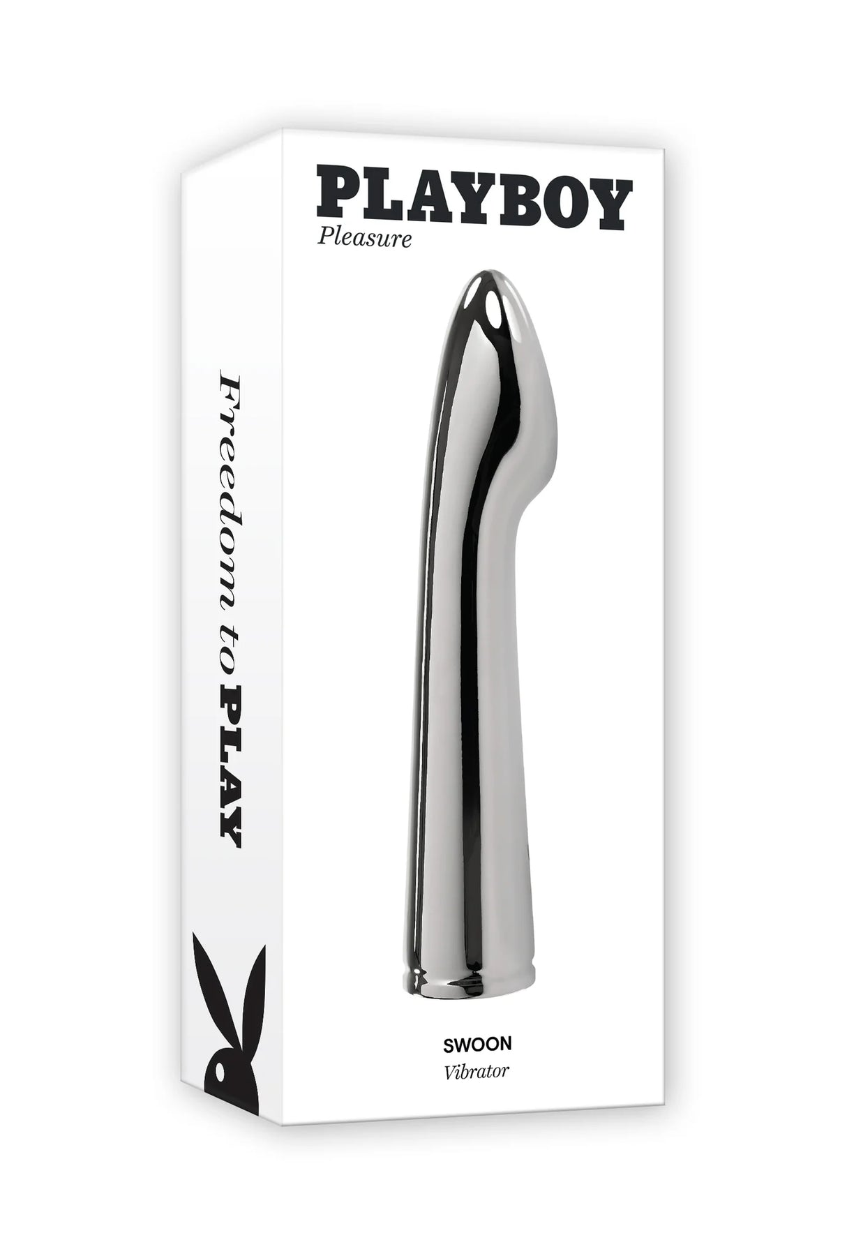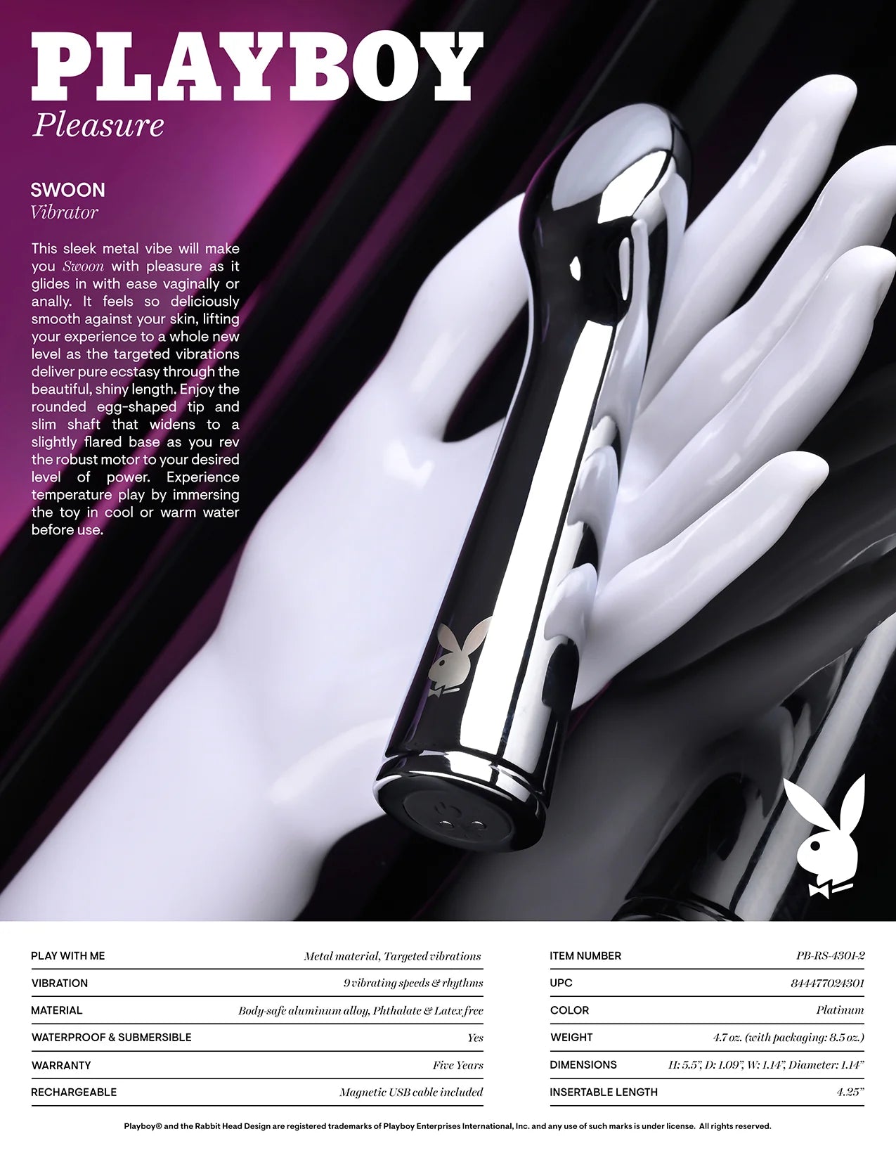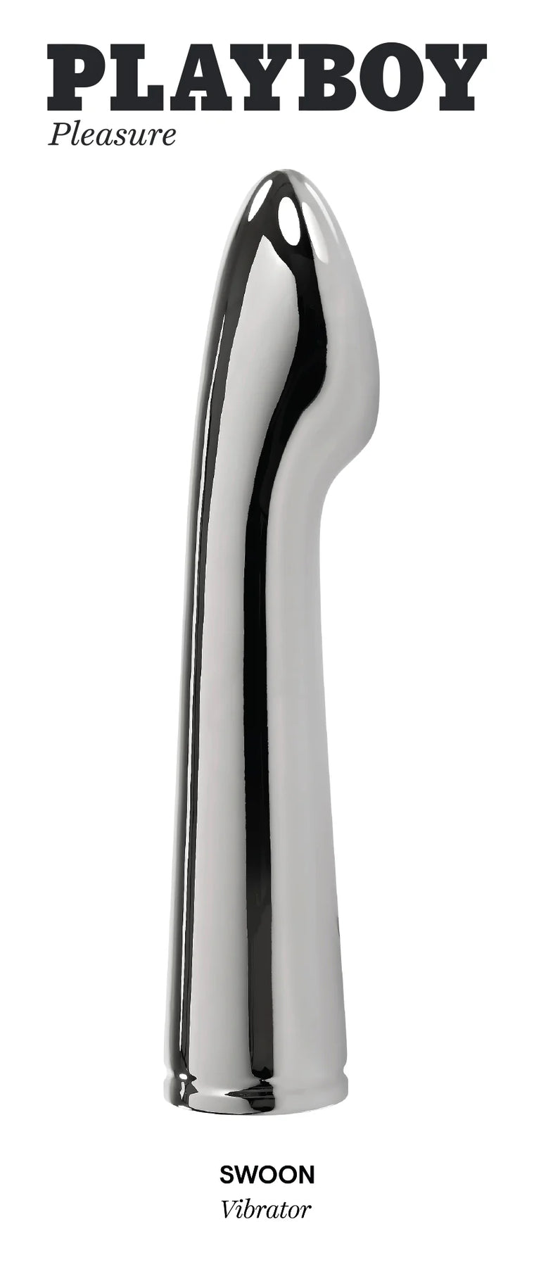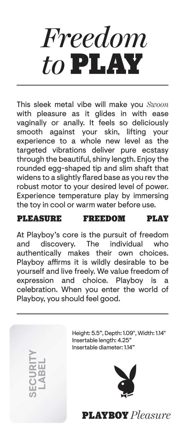 Playboy Pleasure Swoon from Evolved Novelties. Freedom to Play: this sleek metal Vibrator will make you Swoon with pleasure as it glides in with ease vaginally or anally. It feels so deliciously smooth against your skin, lifting your experience to a whole new level as the targeted vibrations deliver pure ecstasy through the beautiful, shiny length. Enjoy the rounded egg shaped tip and slim shaft that widens to a slightly flared base as you rev the robust motor to your desired level of power. Experience temperature play by immersing the toy in cool or warm water before use. Panel details: Play with me key feature: Metal material, Targeted vibrations. Vibration 9 vibrating speeds and rhythms. Materials: body safe Aluminum alloy, Silicone button. Waterproof and submersible. 5 years warranty. Rechargeable: Magnetic USB cable included. Size specifications: Height 5.5 inches, Depth 1.09 inches, Width 1.14 inches. Insertable length: 4.25 inches, Insertable diameter 1.14 inches. Categories: Anal Toys, Probes, Sticks and Rods, Eco-Friendly Sex Toys, Rechargeable Vibrators, G-Spot Vibrators, Sex Toys for Men, Women. 2024.