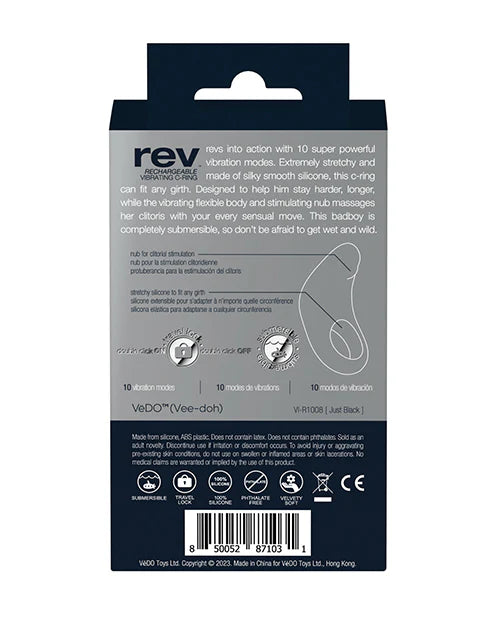 Vedo Rev Rechargeable C-Ring Vibrating Black. REV revs into action with 10 super powerful vibration modes. Extremely stretchy and made of silky smooth Silicone, this C-Ring can fit any girth. Designed to help you stay harder, longer while the vibrating flexible body and stimulation nub massages her clitoris with every sensual move. This bad boy is completely submersible, so do not be afraid to get wet and wild. Size 3.25 inches by 1.75 inches. Package size 3.25 inches by 2.25 inches by 5.25 inches. Rechargeable Cock Ring charge time 100 minutes, play time 90 minutes.