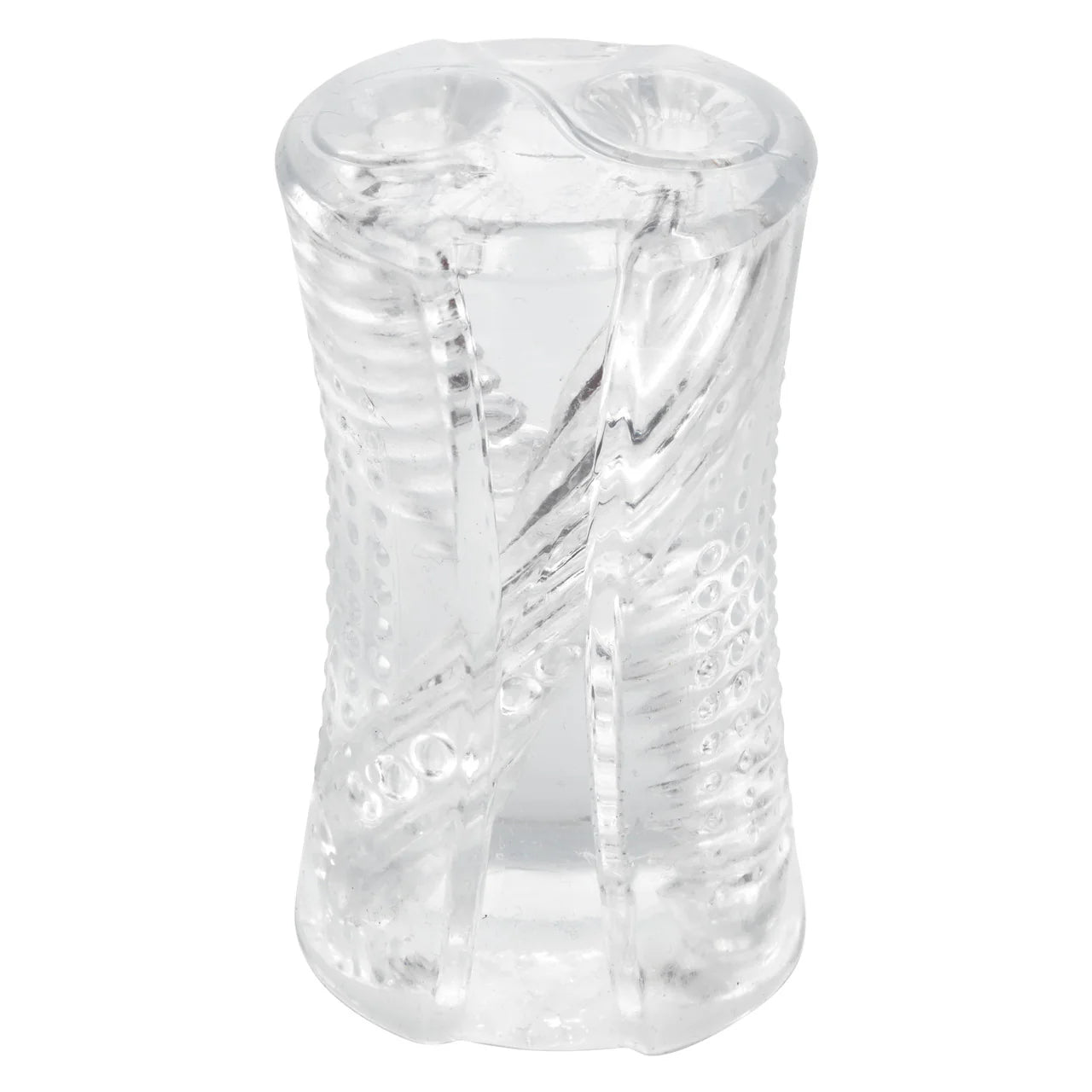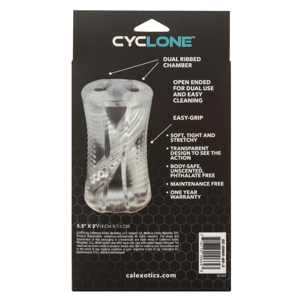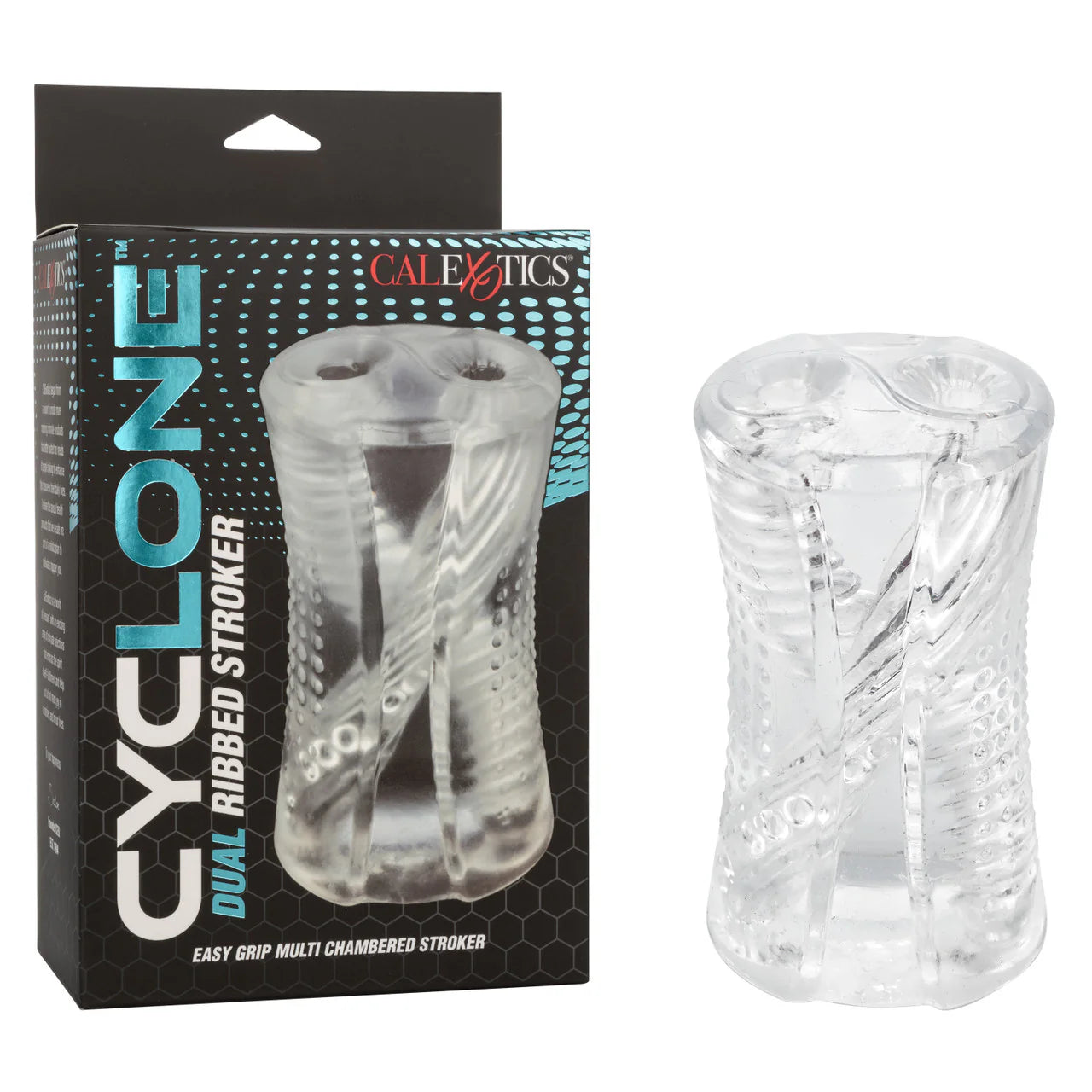 Cyclone Dual Ribber Stroker 5.5 inches Clear from California Exotic Novelties. Experience the intense pleasure of the Cyclone Dual Ribbed Stroker. This innovative masturbator is designed to provide you with mind blowing sensations and an incredible visual experience. The easy grip design of the stroker allows for a secure and comfortable hold, giving you full control over your pleasure. Its dual ribbed chamber design adds extra stimulation, creating a whirlwind of pleasure with every stroke. The transparent design lets you see all the action, adding an exciting visual element to your experience. Made from soft, tight, and stretchy material, the Stroker provides a life like feel that will leave you breathless. The open ended design allows for dual use and easy cleaning. Indulge in the Cyclone and let its multi-chambered stimulation take you to new heights of pleasure. Whether you prefer a gentle swirl or an intense sensation, this stroker is sure to satisfy your desires.