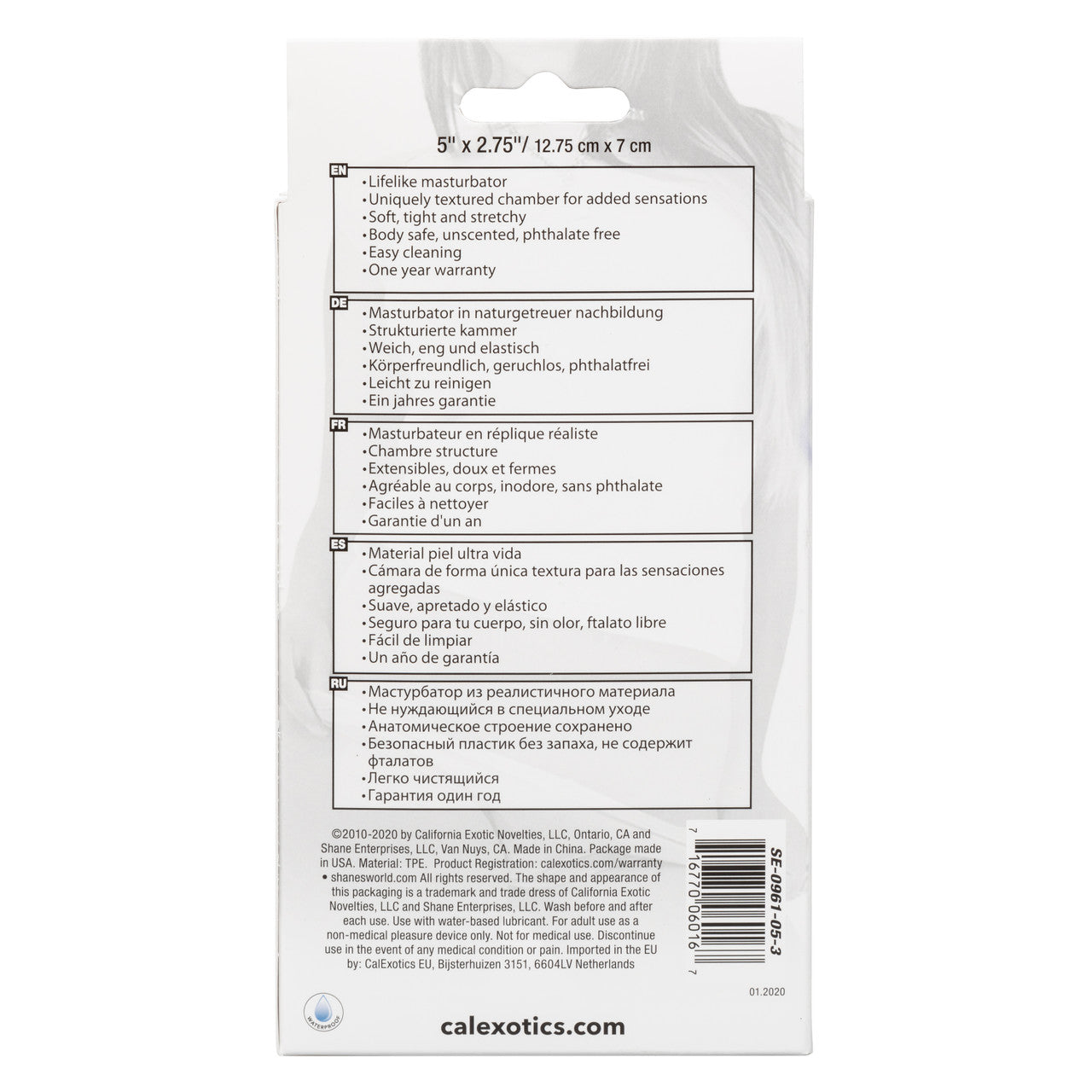 Shane's World College Tease Stroker Blue from California Exotic Novelties. It is your lucky night. You finally landed that little tease that everybody wants to bang. The Shane’s World College Tease is ready to go all night with you as you stretch her out, pound her hard, and see just how many inches she can take. This 5 inches by 2.75 inches Masturbator is ready to party tonight and do anything to please you. She is super soft and ultra stretchy. Everything you knew she would be. You will love the crazy tight little Pussy that is just begging to be stretched wide. She is ready to tease you, please you, and fulfill your every desire. Lube up your Cock and glide against those soft, heavenly walls to find that the ribbed internal chamber is primed and ready to deliver maximum pleasure. Go nice and slow for some seriously irresistible teasing or release a day’s worse of torturous desire and pound her with all you have got. Regardless of what you are in the mood for, she is always ready to make those fantasies a reality. Close your eyes and glide your cock between her lips while you revel in that sweet moment of super llife like penetration. Spread her wide and let this realistic Pussy drive you wild tonight. Soft and tight and she will go all night! Shane's World Strokers College Tease Blue. Pull an all nighter! Super soft and stretchy Masturbators with ribbed pleasure tunnels. Safe and pure for body and pleasure. Made using phthalate free, non-toxic materials unscented Thermoplastic Elastomers TPE. Masturbator measures 5 inches long by 2.75 inches wide. Bulk weight 6.2 ounces. Always clean before and after use. A water based personal lubricant is recommended. Shane's World Strokers College Tease is a registered trademark for California Exotic Novelties. Sex toys and sexual wellness. Categories: Male Masturbators, Sex Toys for Men, Solo Masturbators, Pussy Strokers, Masturbators Porn Star, Masturbation Sleeves. 2023.