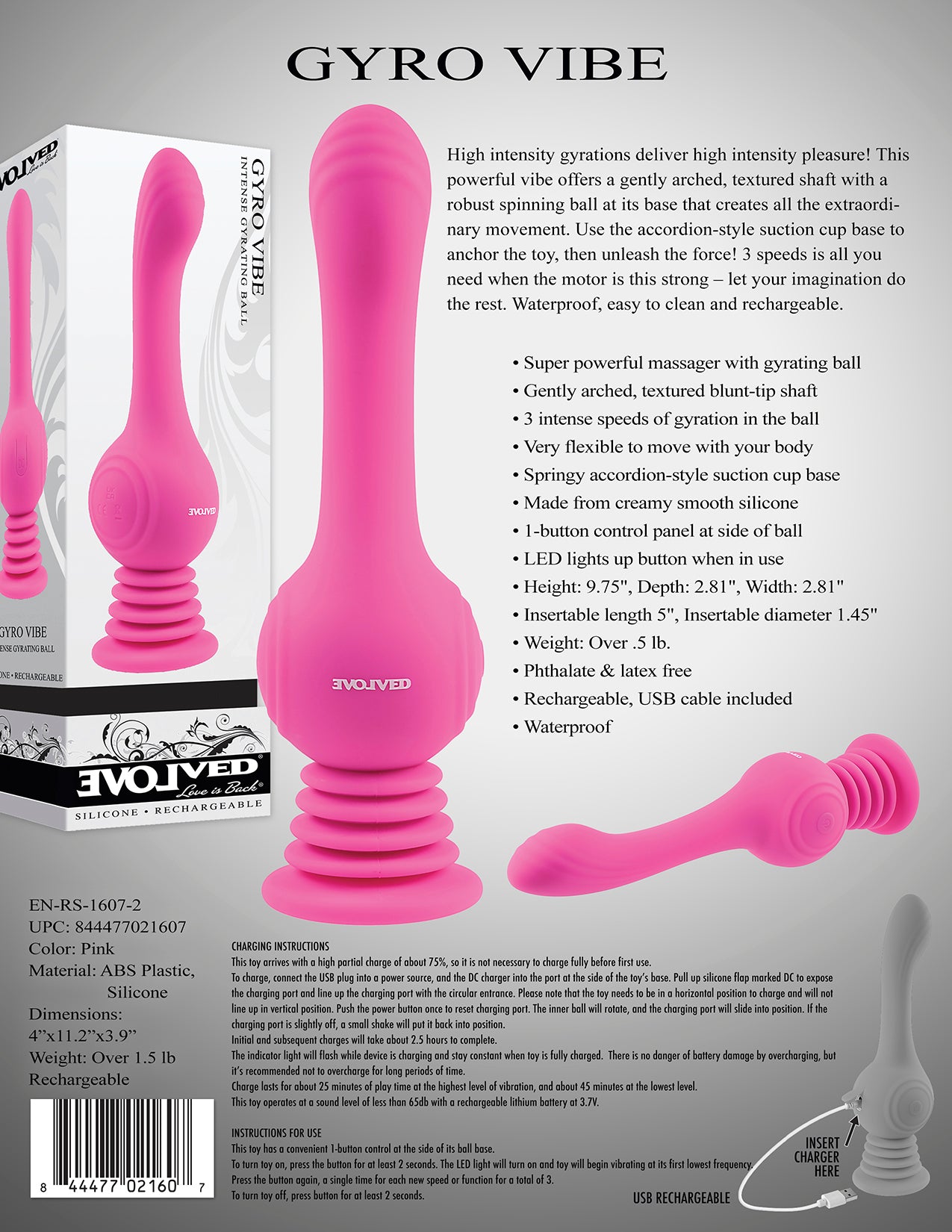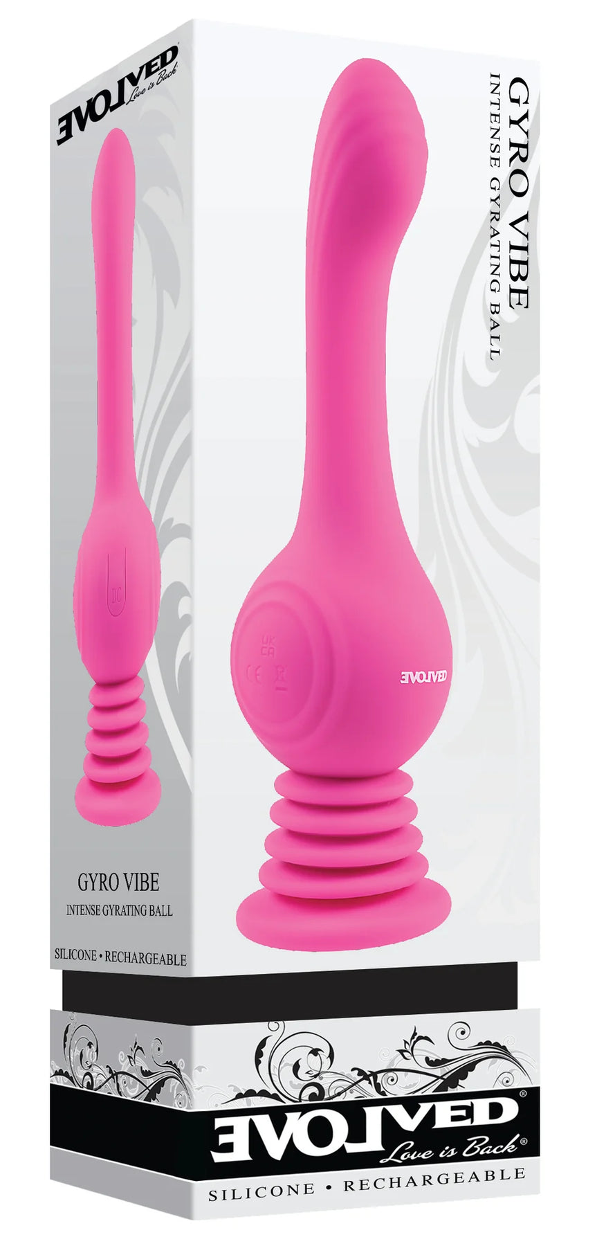 Evolved Gyro Vibe is a high intensity gyrations deliver high intensity pleasure! This powerful vibe offers a gently arched, textured shaft with a robust spinning ball at its base that creates all the extraordinary movement. Use the accordion style suction cup base to anchor the toy, then unleash the force! 3 speeds is all you need when the motor is this strong. Let your imagination do the rest. Waterproof, easy to clean and rechargeable.