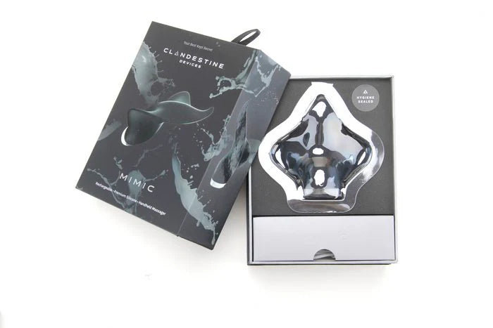 Clandestine Devices Mimic Massager Manta Ray shaped Black hand held is a sensory experience. Designed to be touched. Mimic took shape with the human form in mind. Acting like an extension of the hand, Mimic was designed with a user friendly interface, thoughtful colors, and features to ease use in the dark and underwater. It is not necessarily limited by gender, only the imagination. Mimic is unlike any other, it is soft, sleek, slender, and feminine. Mimic was crafted with comfort and pleasure in mind. Its unique, ergonomic shape fits perfectly in the curve of your hand. You can easily access the simple thumb controlled interface, which allows eight intense vibration patterns to travel to their pinpoint location or a more broad sensitive zone via the body, wings, and tip. Apply Mimic to the body to stimulate the clitoris, labia, and vulva. Massager is designed to hit multiple pleasure points at one time for a mind blowing sensation. Or use it with a partner. The thin device allows you to hold it between your bodies while being close for clitoral stimulation and penetration during intercourse. The USB rechargeable Mimic is waterproof for fun in and out of the water and easy cleanup. Vibrator features: 8 vibration patterns. Keeps things interesting. Made using body safe Silicone for your most sensitive parts. 100% waterproof. Enjoy anywhere. Travel lock make your journey memorable. LED Glow for when the lights go down. Discreet vibrations a secret worth keeping. USB Rechargeable. One year warranty provided by Clandestine Devices. Silicone shaft, ABS plastic base. 4.2 inches overall length. 1.5 inches top, 2 inches center by .75 inch top and .9 inch bottom. Clandestine Devices - Mimic Massagers. Categories: Vibrators, Clitoral, Rechargeable Vibrators, Sextoys for Women. Restricted, Amazon Restricted. 2023.