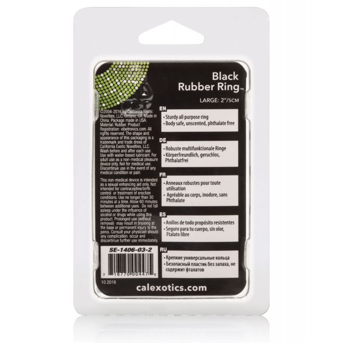Explore your exotic secret dreams and wild fantasies with the sleek and smooth Rubber Ring. The large size erection enhancer is easy to use, comfortable to wear, and ideal for arousal stimulation and performance extension. The flexible rubber adornment ring is the perfect accessory for super-sizing your seduction and pleasure. Slip on the enhancer and maximize your intimate, sensual encounters, while extending performance and climax satisfaction. The large size, stretchy enhancer measures a generous 2.5”/6 cm in diameter and is designed for erection stimulation and performance maintenance. The flexible ring is made from soft and smooth rubber and comfortably slips onto the erect penis for stimulation support during intimate pleasure. To maximize sensitivity, and to heighten the orgasmic ecstasy, it is recommended that you use a quality lube with this toy. Indulge in erotic experimental play with the versatile, comfort fit accessory that promises ultimate gratification. Use the enhancer for performance maintenance and play extension. The easy to use enhancer is ideal for spontaneous pleasure and is suitable for first-time and experienced users. The discreet, large enhancer ring can be used with your favorite vibrating stimulator toys. Slip on the flexible ring and prepare for tantalizing sensations, and extended intimate ecstasy. Super-size your mind-blowing explosions with the rubber ring. Before and after every use, clean the adornment ring with a toy cleaner spray, or wash in warm, soapy water.