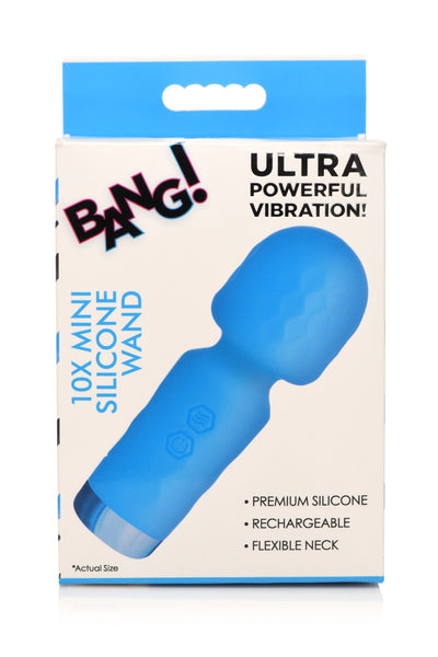 Bang! 10X Mini Silicone Massage Wand Blue from XR Brands. This is for the discreet hedonists. For those always ready for fun. This is for those travelers who bring their sex toys along. For the overnight stays and nights you get lucky. This Mini Wand fits perfectly between you and your partner for steamy sessions where just a little more stimulation does the trick. It fits in purses, bags and deep pockets. Made from premium Silicone. It is phthalate free, silky smooth and soft against sensitive skin. The flexible neck bends in just the right angles. Enjoy 3 speeds and 7 patterns of vibrating bliss on any body part that craves a little more attention. It is splashproof, too! It can handle gentle sprays of water or other fluids. After your self love session, simply wash it with warm water and mild soap, then spray it with a toy cleaner and pat dry. Use water based personal lubricant to keep things slippery and sexy, then turn on the vibrator and use it anywhere you want! Buzz it against those sensitive Nipples. Bring it down to the head of your Shaft or your Clitoris. It can easily fit between you and your partner during sex if you want a little extra stimulation while they are playing with you or inside you. Take it with you on trips or overnight stays and always keep yourself satisfied with a powerful, buzzing quickie! Bring it along and surprise your partner with it. Both men and women can keep it on them to ensure the night will be full of pleasure! Measurements of the Mini Massager: overall length 4.5 inches. Head diameter 1.6 inches. Materials: Silicone, ABS Plastic. Color: Black. Note: please use only with water based personal Lubricants. Recharge using the USB cable provided. Do not submerge under water. Key features of the Mini Wand: powerful vibration. Choose between 3 speeds and 7 patterns of power packed in a small wand with a flexible head. Petite design. This small wand is perfect for travel, overnight stays, date nights, quickies and fitting it between you and your partner's bodies during sex. Premium Silicone: Made with premium, silky smooth, phthalate free Silicone. Rechargeable and Splashproof: Recharge using the USB cable provided. Rated IPX5 waterproof so it can handle gentle jet streams but should not be submerged under water. Categories: Vibrators, Rechargeable Vibrators, Flexible Vibrators, Clit Stimulators, Magic Wands, Body Massagers, Flexible Vibrators, Palm Size Massagers, Health and Beauty Aids. 2023.