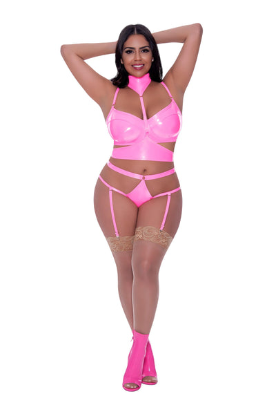 Club Candy Bra, Harness and Panty Pink 2XL from Magic Silk Lingerie. From the Exposed by Magic Silk collection, this style includes: a demi bra featuring hook and eye closure in the back with an attached collar harness, clear o-ring details throughout and a matching panty with an attached garter. Sweet Bubblegum pink meets slick and slippery wet look fabric. Fabric content: 55% Polyurethane, 40% Polyester, 5% Spandex. Care instructions: hand wash cold water. No bleach. Dry flat. Ladies plus size 1X/2X. Dress sizes 20 and 22. Categories: Lingerie, Clothing, Bra Sets, Naughty Role Play, Plus Sizes, Women's Underwear. 2023.